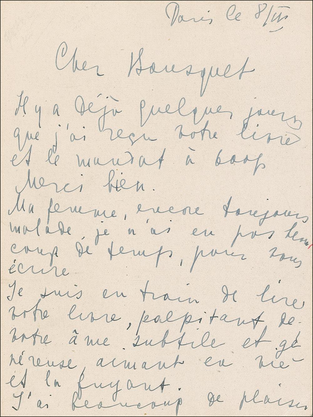 Russian-born artist (1887–1985) whose colorful, fanciful depictions of peasant life, Judaica, and other subjects earned him a place among the best-known visual artists of the 20th century. ALS in French, one page both sides, 4 x 5.5, April 8. Letter to writer Joe Bousquet, for whom Chagall painted some illustrations for his book. In part (loosely translated) “It has been a few days since I received your book…thank you. My wife is still sick, I do not have much time to write. I'm reading [through] your book, your heart-palpitating, subtle and generous, loving life…. I take great pleasure in reading it, to be closer to you….” In fine condition, with a bit of scattered light toning and soiling.