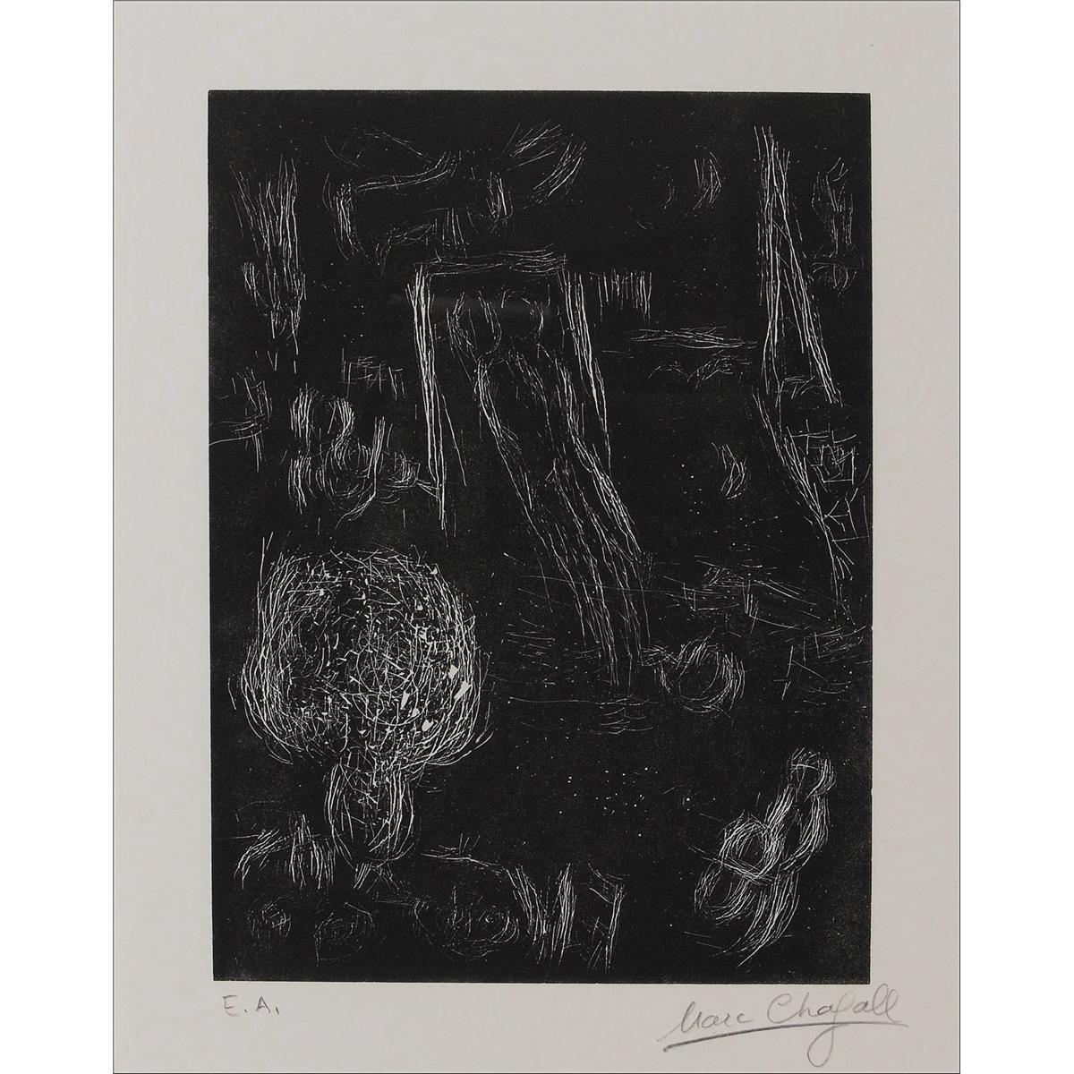 Print of one of his works, 11.25 x 14.75, depicting a starkly contrasted outdoor scene, signed in the lower border in pencil, “Marc Chagall.” Print is affixed by one corner to a 14.25 x 18 piece of artist’s cardstock, and matted to the same size. In fine condition.