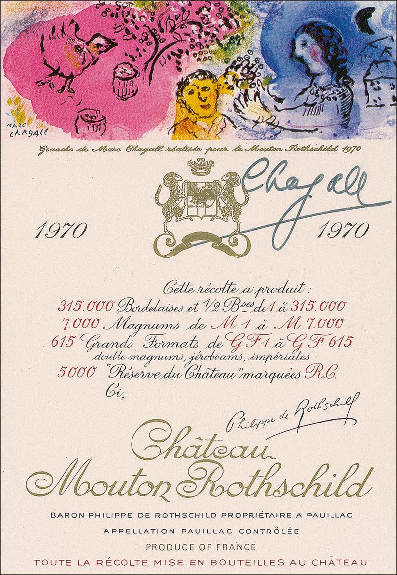 Chateau Mouton Rothschild wine label, 4 x 5, from 1970, bearing a beautiful color Chagall design at the top, signed in black felt tip, “Chagall.” In very fine condition.