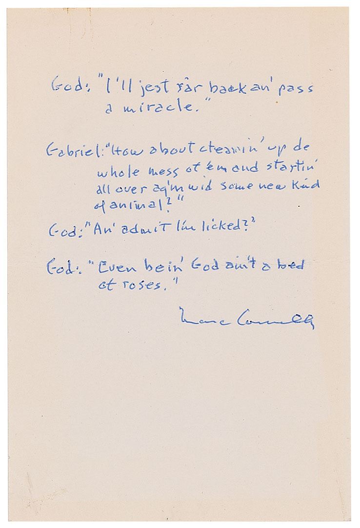 Pulitzer Prize–winning American playwright and director (1890–1980) remembered as one of the wittiest members of the Algonquin Round Table. AQS on an off-white 4 x 6 card, signed at the conclusion, "Marc Connelly." Connelly quotes from his Pulitzer Prize–winning play The Green Pastures, featuring nine lines of dialogue between God and Gabriel, concluding with God's remark: "Even bein' God ain't a bed of roses." In fine condition, with a central horizontal fold.