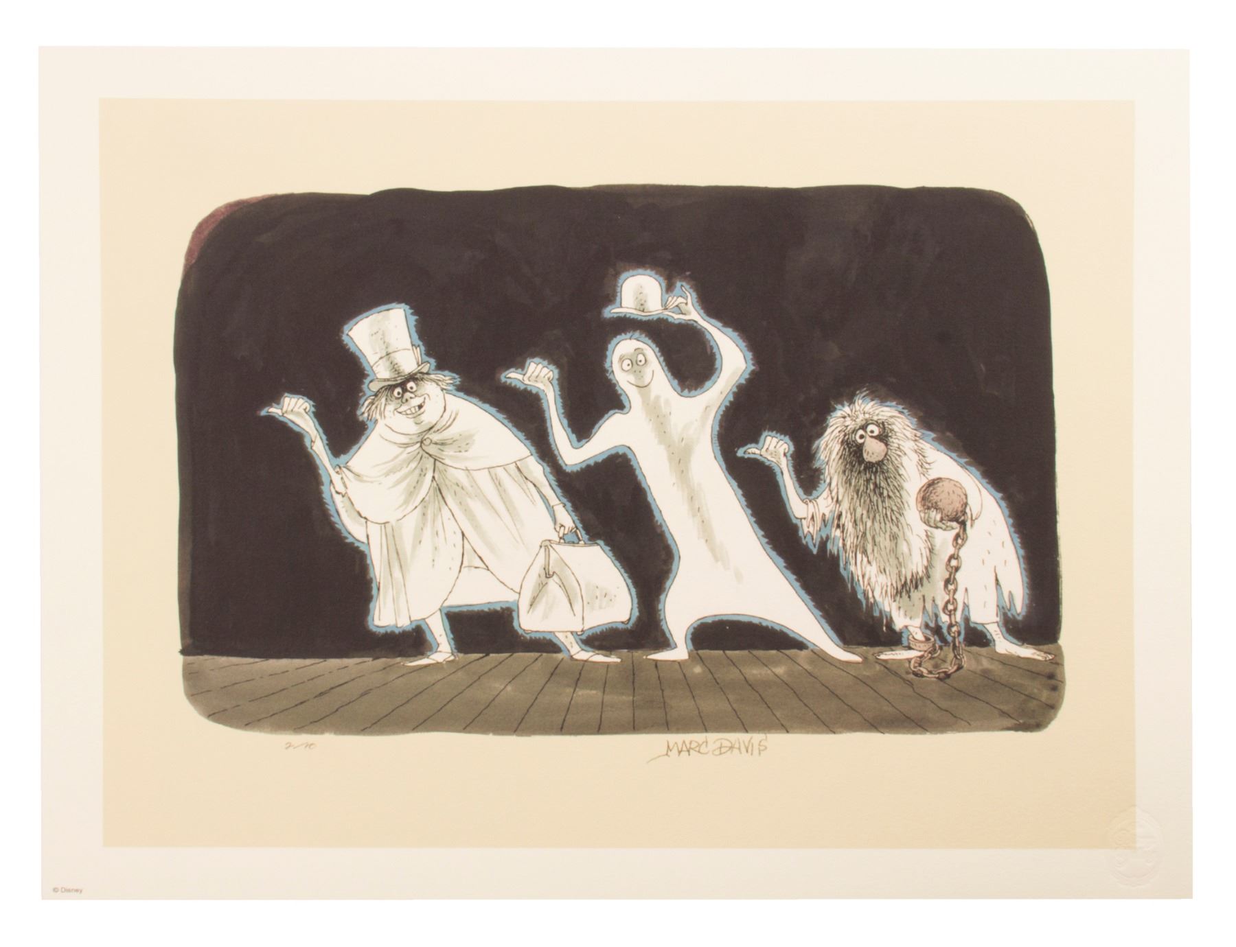 (Disneyland, 1999) An incredibly rare set of (6) high-quality giclee prints featuring the iconic concept artwork of Imagineer Marc Davis for the Haunted Mansion. This is one of the most difficult Haunted Mansion collectibles to obtain. Each print is signed by Davis, and numbered 2 out of only 10 sets produced. Together, these giclee prints of Davis' artwork beautifully archive the creation of this historic attraction. The set comes in an elegant display box with velvet and felt lining, and includes white museum gloves for handling the giclees. Each giclee measures 16"x20" and the set is in very fine condition with minor surface wear to the outer box. The original Disney Gallery numbered Certificate of Authenticity is included.