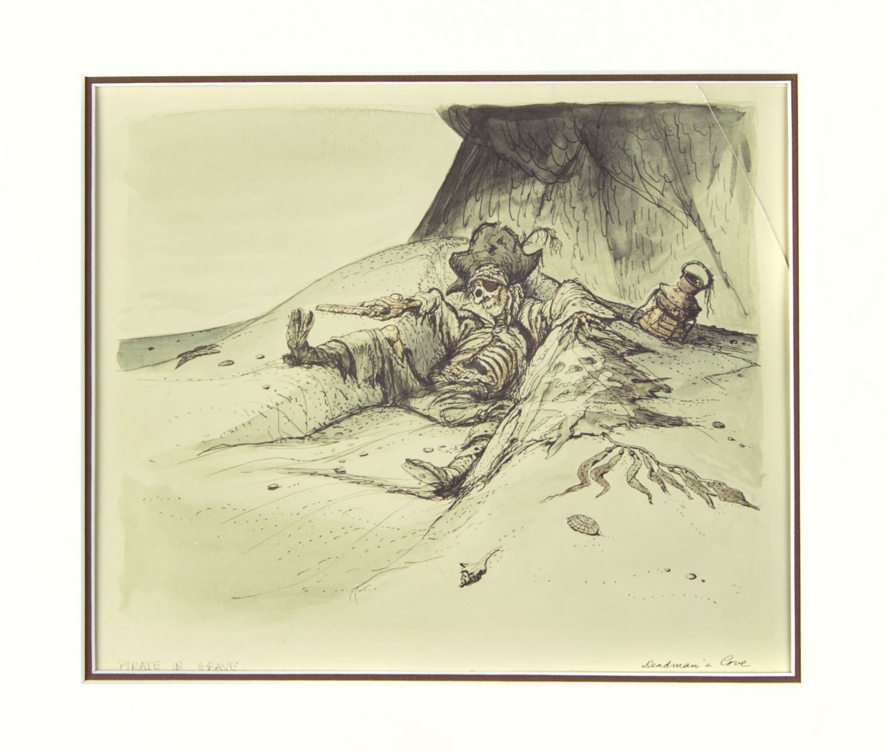 (Disneyland, c.1980s-90s) A rare photo print of Marc Davis' concept artwork for Disneyland's "Pirates of the Caribbean" attraction. This iconic artwork was used in promotional materials and had been featured on postcards around the time of the attraction's opening. Titled "Pirate in Grave" and labeled for the "Deadman's Cove" scene, this artwork features a pirate skeleton collapsed in a grave. Original pencil numbering on the back side reads "6601-198C". This photo print measures 8"x10" and is taped along the top-edge to a 11.75"x13" mat. The condition is good with a fold in the top-right corner and some edge-wear.