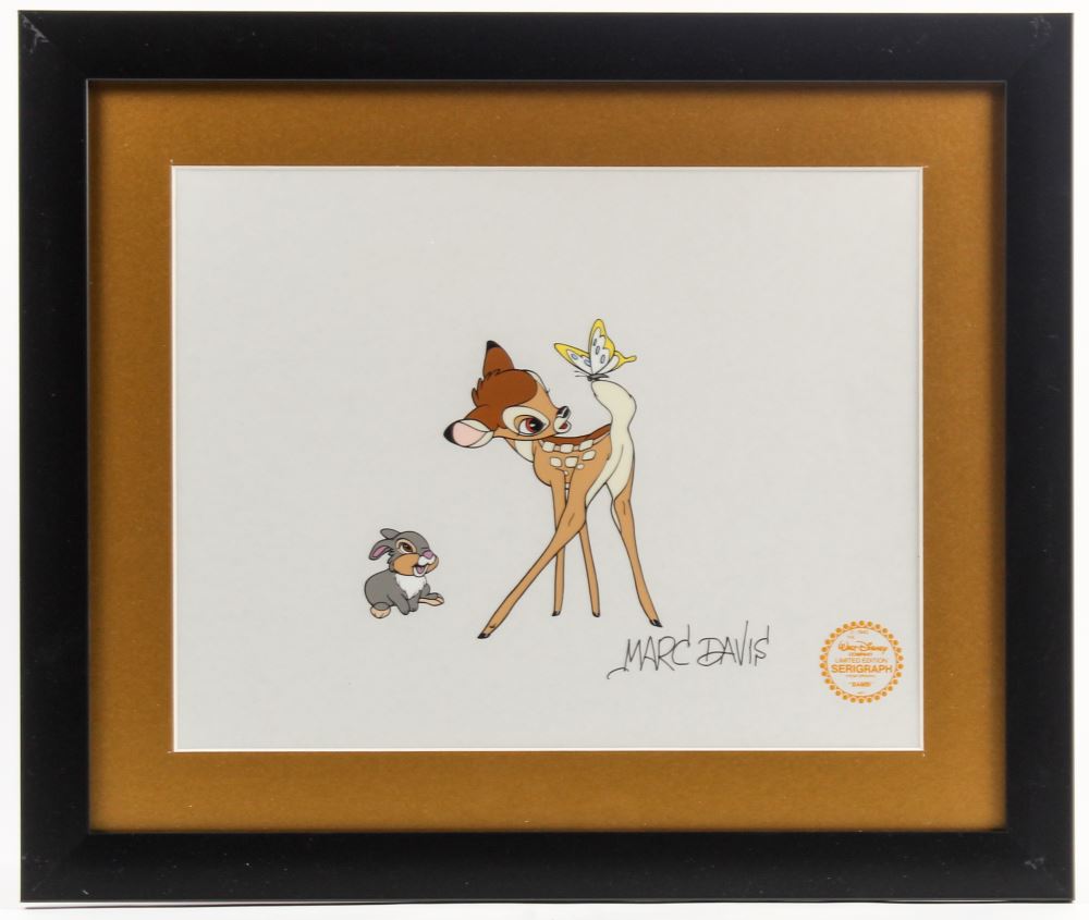 Custom framed display measures 16" x 19" in size and features a Walt Disney serigraph cel animation from Bambi that has been hand-signed in black felt-tip pen by Marc Davis (D. 2000). The serigraph cel is a limited edition.