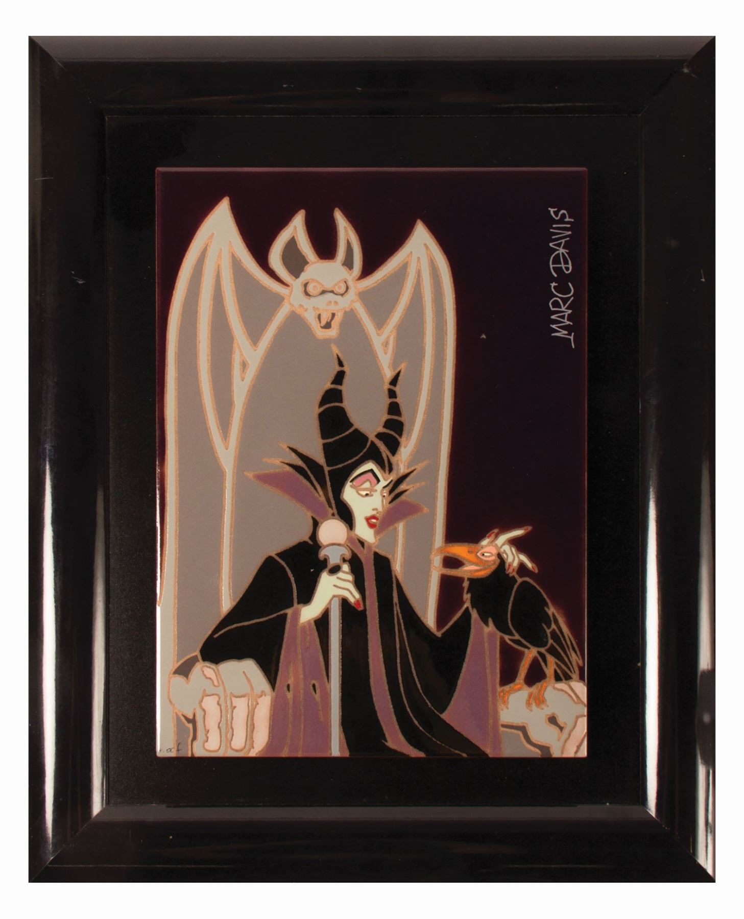(Disney, 2002) A gorgeous ceramic tile featuring Maleficent and Diablo, signed by Disney Legend Marc Davis. The tile is one of only seven artist's proofs created for this Davis piece, which was sold at the Magic Kingdom's 999 Happy Haunts Ball. It is marked "Proof" in the lower left corner. In addition to the facsimile signature which is a present of the tile, the piece is also signed by Davis on the reverse of the frame in gold ink. The tile measures 13"x9.75" and is mounted in a 19.25"x16" frame. The condition is very good with some wear to the ink of the proof marking, and some minor surface wear to the frame. The original Disney COA is included.