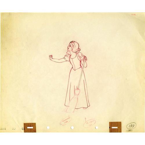 <B>Marc Davis - "Snow White and the Seven Dwarfs" Animation Production Drawing Original Art (Disney, 1937).</B></I> Snow White enchants in this animation production drawing from the first full-length animated feature film to incorporate both color and sound (OPD #133). Rendered and initialed by one of Disney’s Nine Old Men, Marc Davis, in graphite and red pencil on a 12 field sheet of animation paper (12" x 10"), the art includes Disney studio stamps. There is some paper tanning, and light edge wear; otherwise the condition is Very Good.<BR><BR><b>Shipping:</b> Flat Material, Small (<a target="_blank" href="http://www.heritageauctions.com/common/shipping.php">view shipping information</a>)