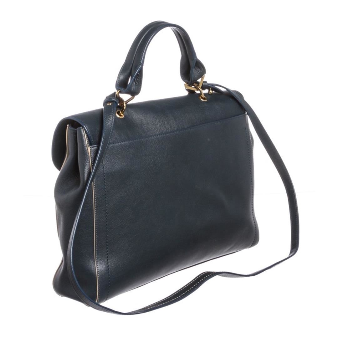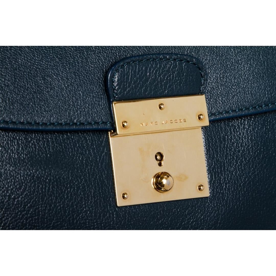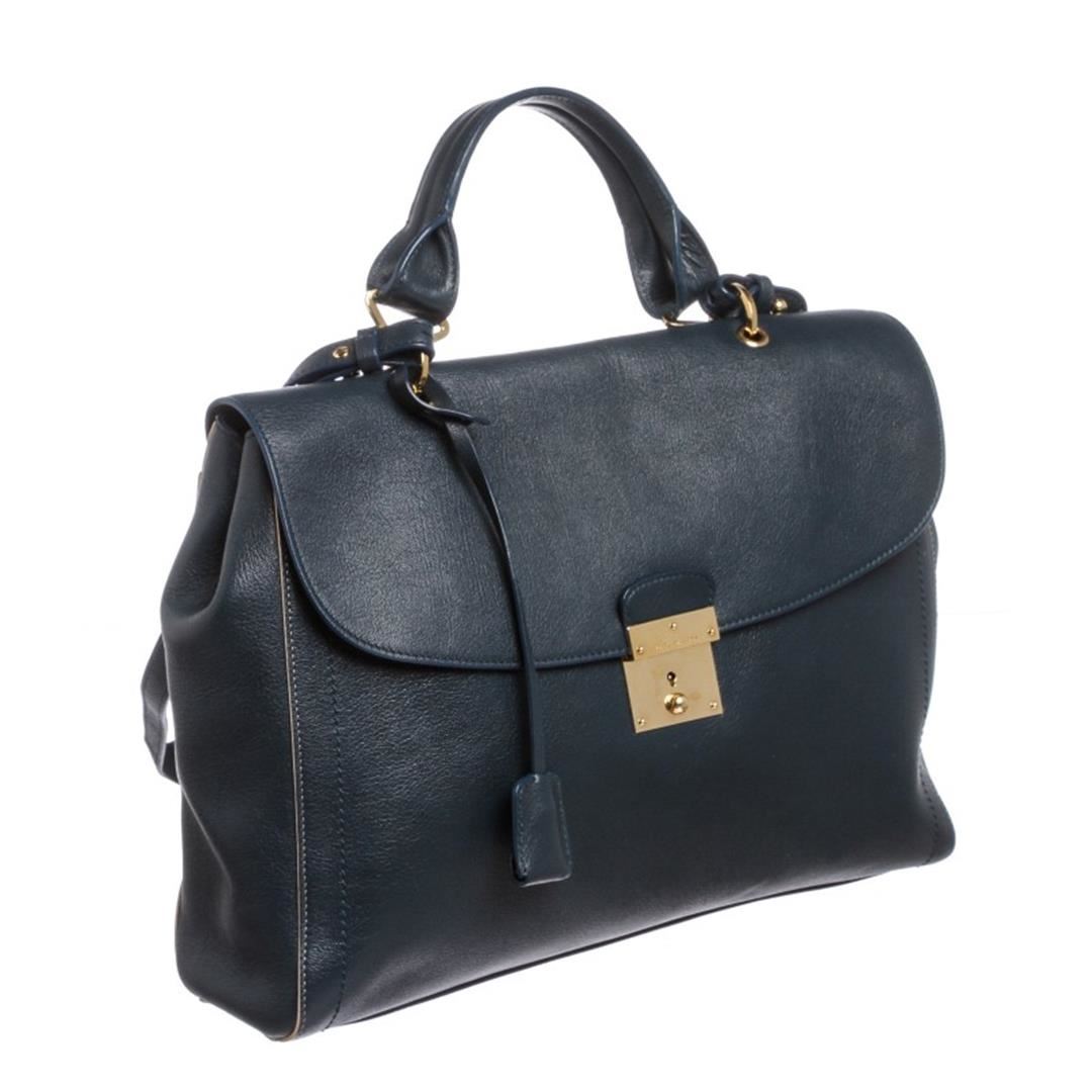 Dark blue leather, gold tone hardware, single flat handle, detachable shoulder strap and lock and key closure. Interior is blue fabric lined with one side zipper pocket and two slip pockets. Item is pre-owned.