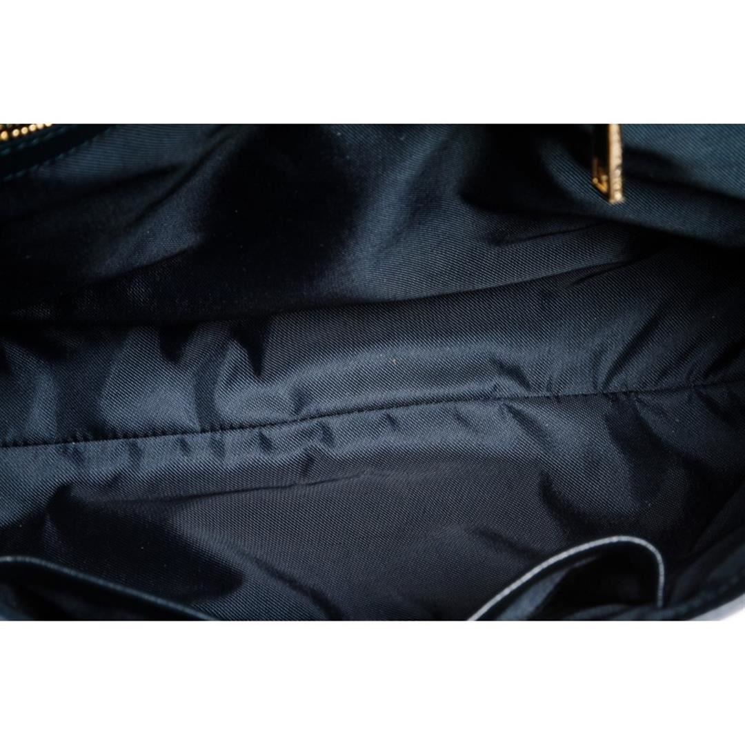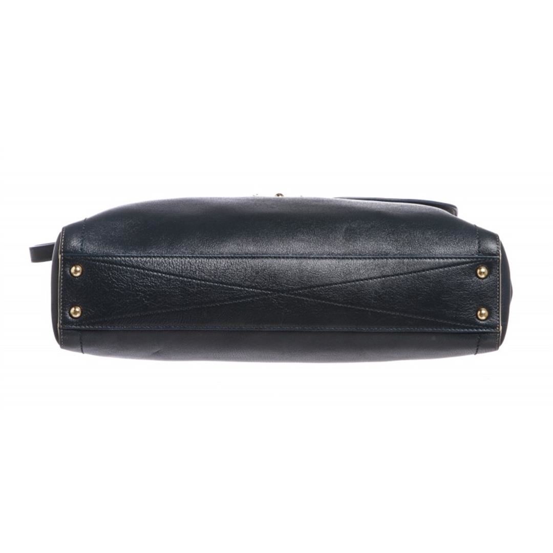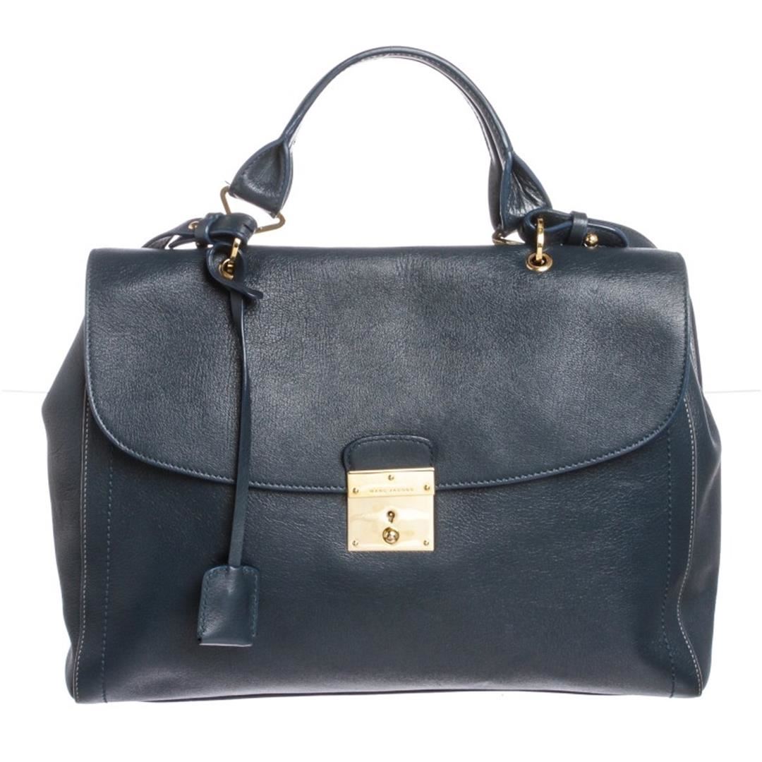 Dark blue leather, gold tone hardware, single flat handle, detachable shoulder strap and lock and key closure. Interior is blue fabric lined with one side zipper pocket and two slip pockets. Item is pre-owned.