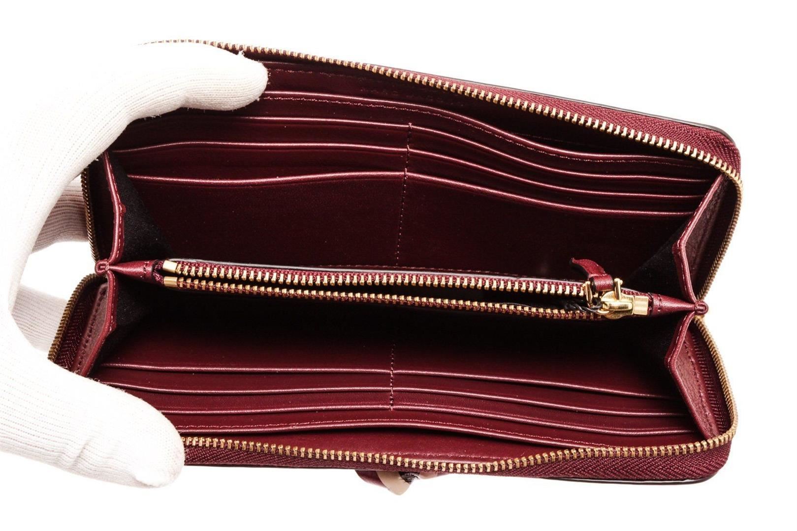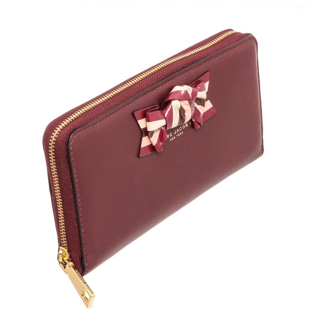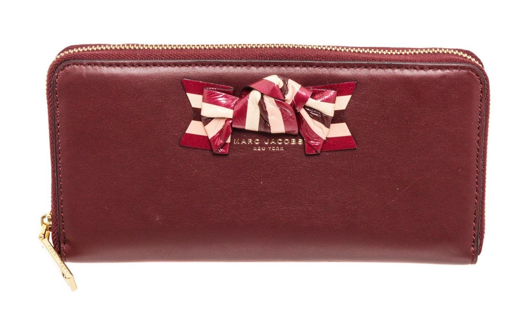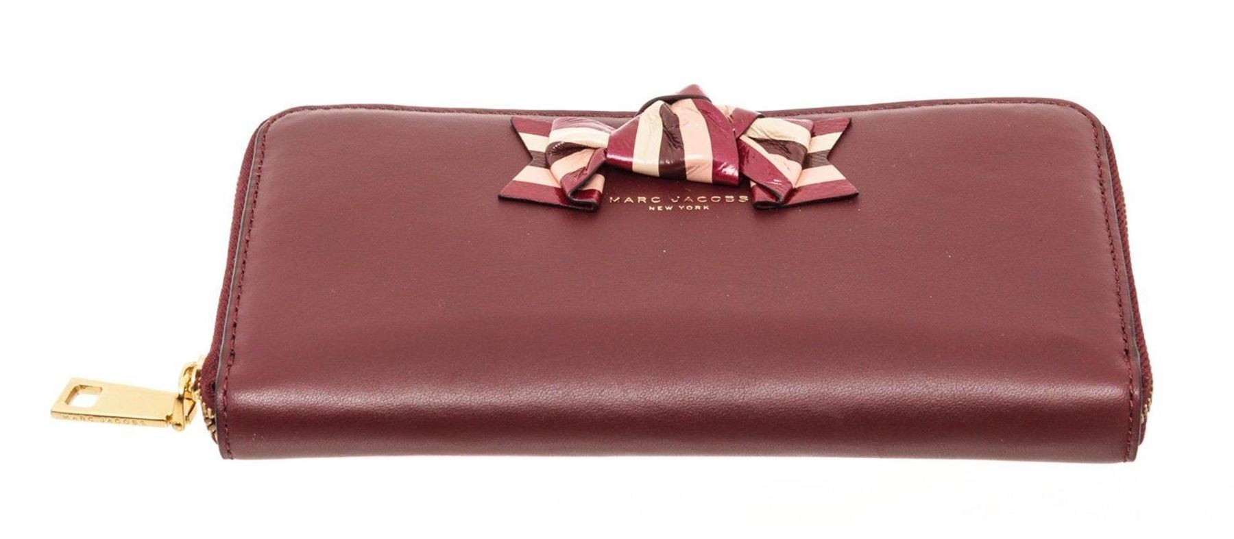 Marc Jacobs Burgundy leather bow zippy wallet with gold-tone hardware, bow shaped leather at front face, burgundy leather interior lining, five interior compartments; one with zip closure, twelve card slots and overall zip around closure.