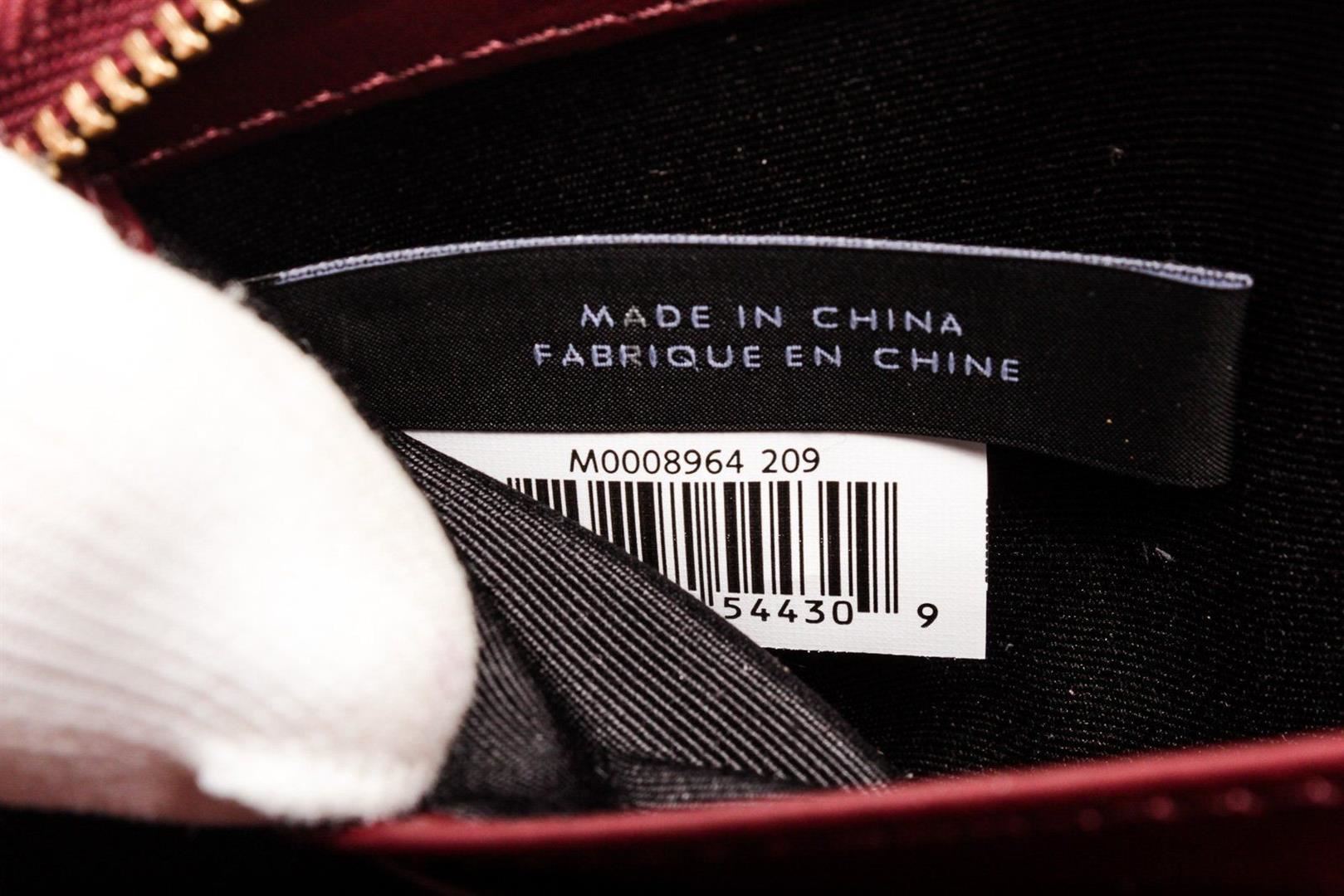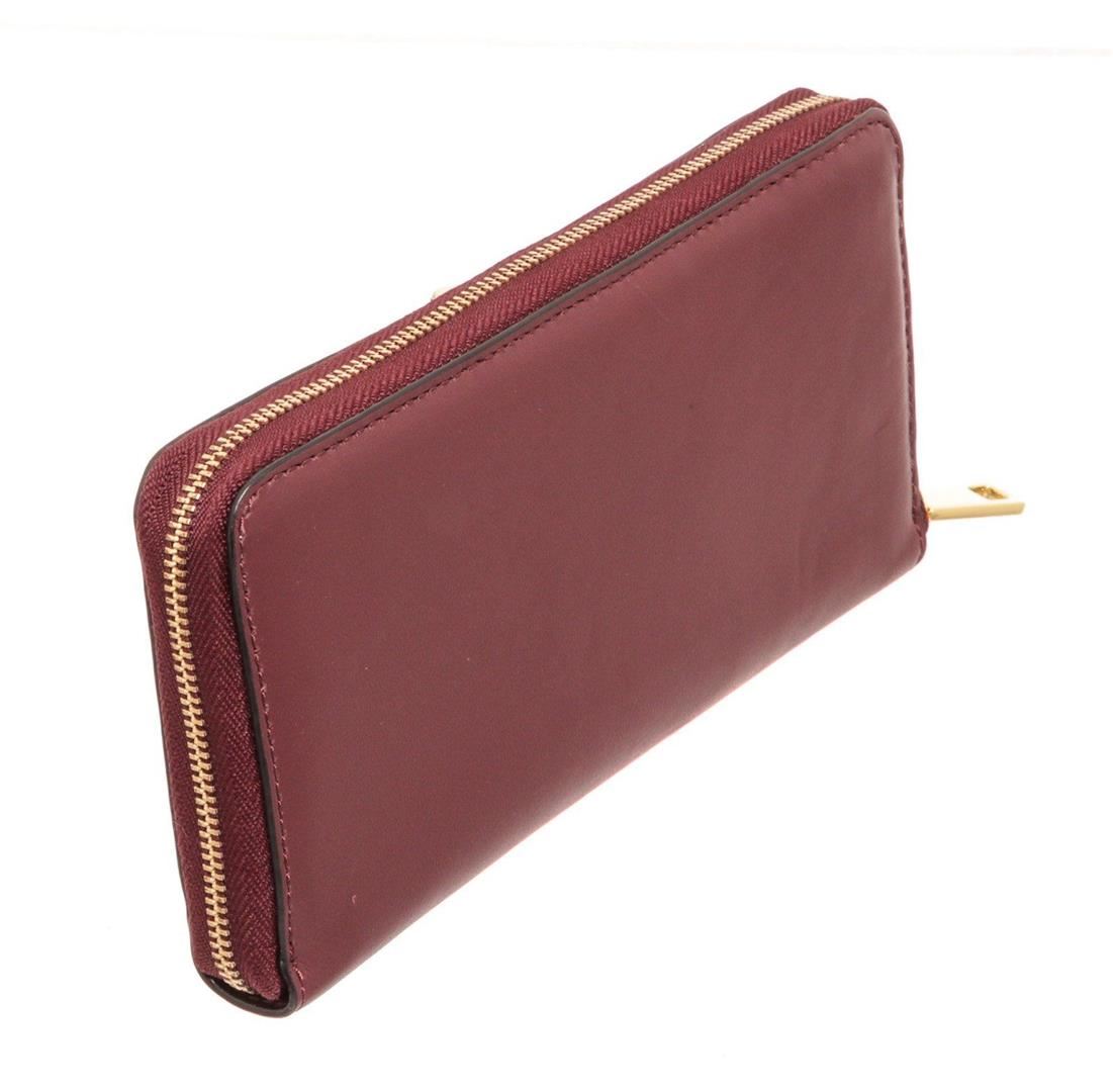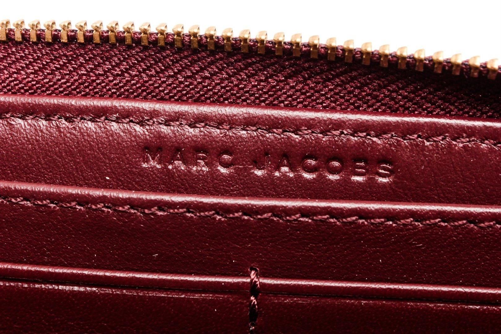 Marc Jacobs Burgundy leather bow zippy wallet with gold-tone hardware, bow shaped leather at front face, burgundy leather interior lining, five interior compartments; one with zip closure, twelve card slots and overall zip around closure.