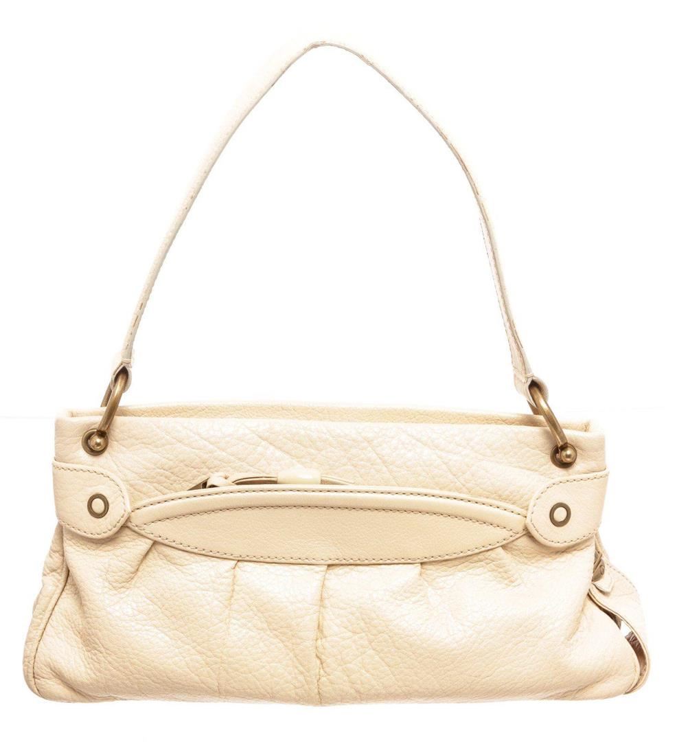 Marc Jacobs Cream Leather Shoulder Bag with gold-tone hardware, interior zip pockets, suede lining, leather shoulder strap, and zipper closure.         Measurements:  Length: 7 in / 18 cm  Width: 13 in / 33 cm  3 in / 8 cmCONDITION: Pre-Owned Good overall, please see photographs for detail.
