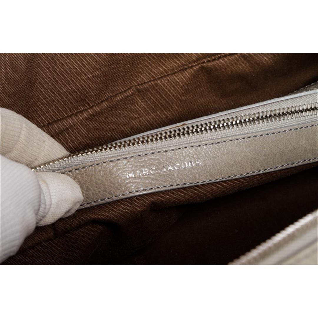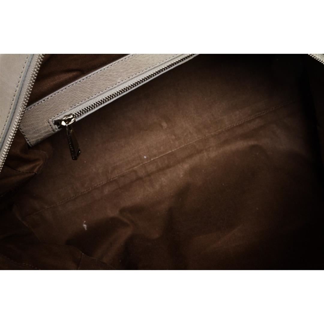 Gray leather, silver tone hardware, dual rolled handles, detachable shoulder strap and zip top closure. Interior is brown fabric lined with one side zipper pocket. Item is pre-owned.
