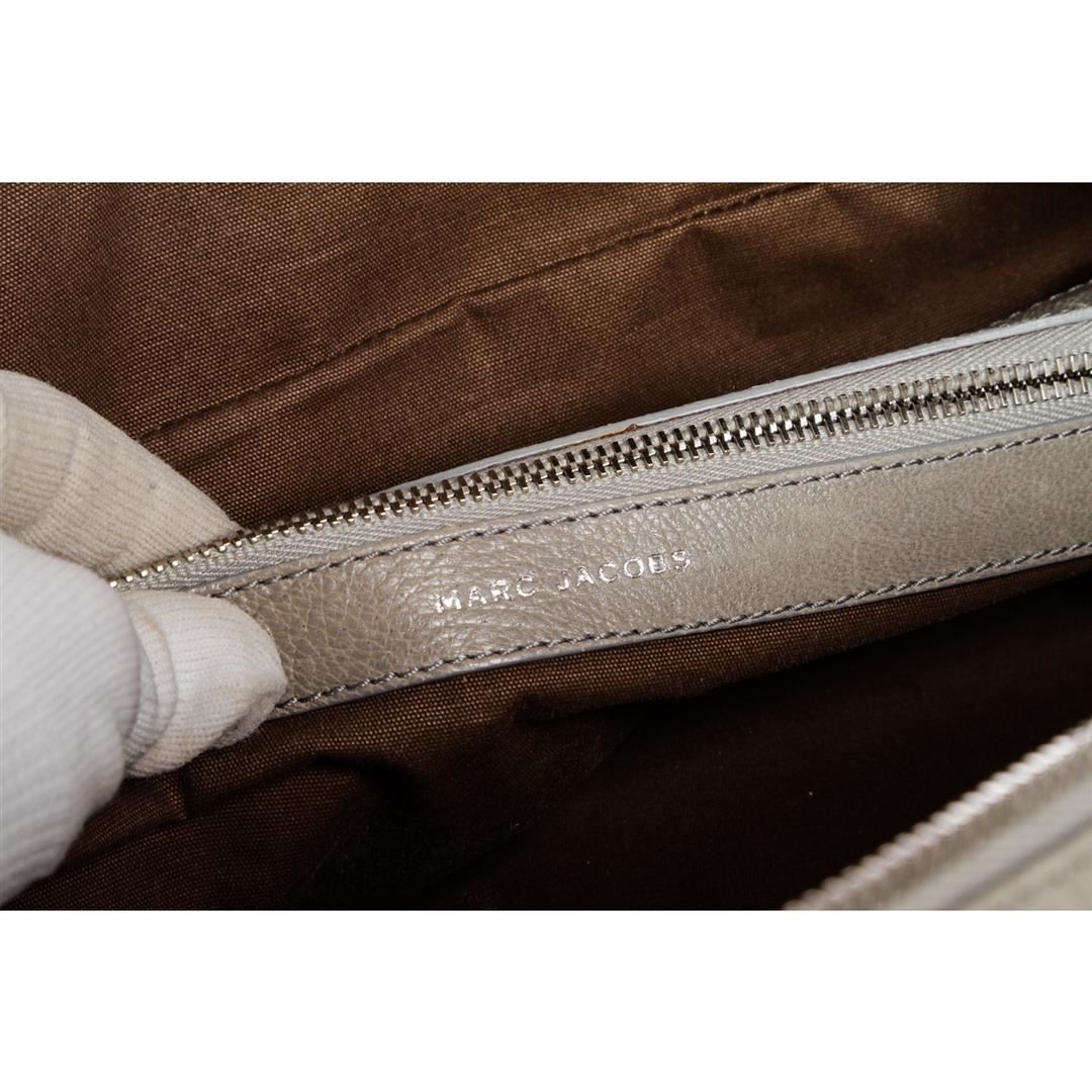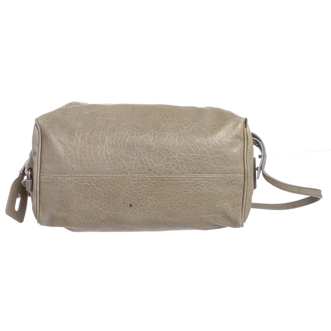Gray leather, silver tone hardware, dual rolled handles, detachable shoulder strap and zip top closure. Interior is brown fabric lined with one side zipper pocket.