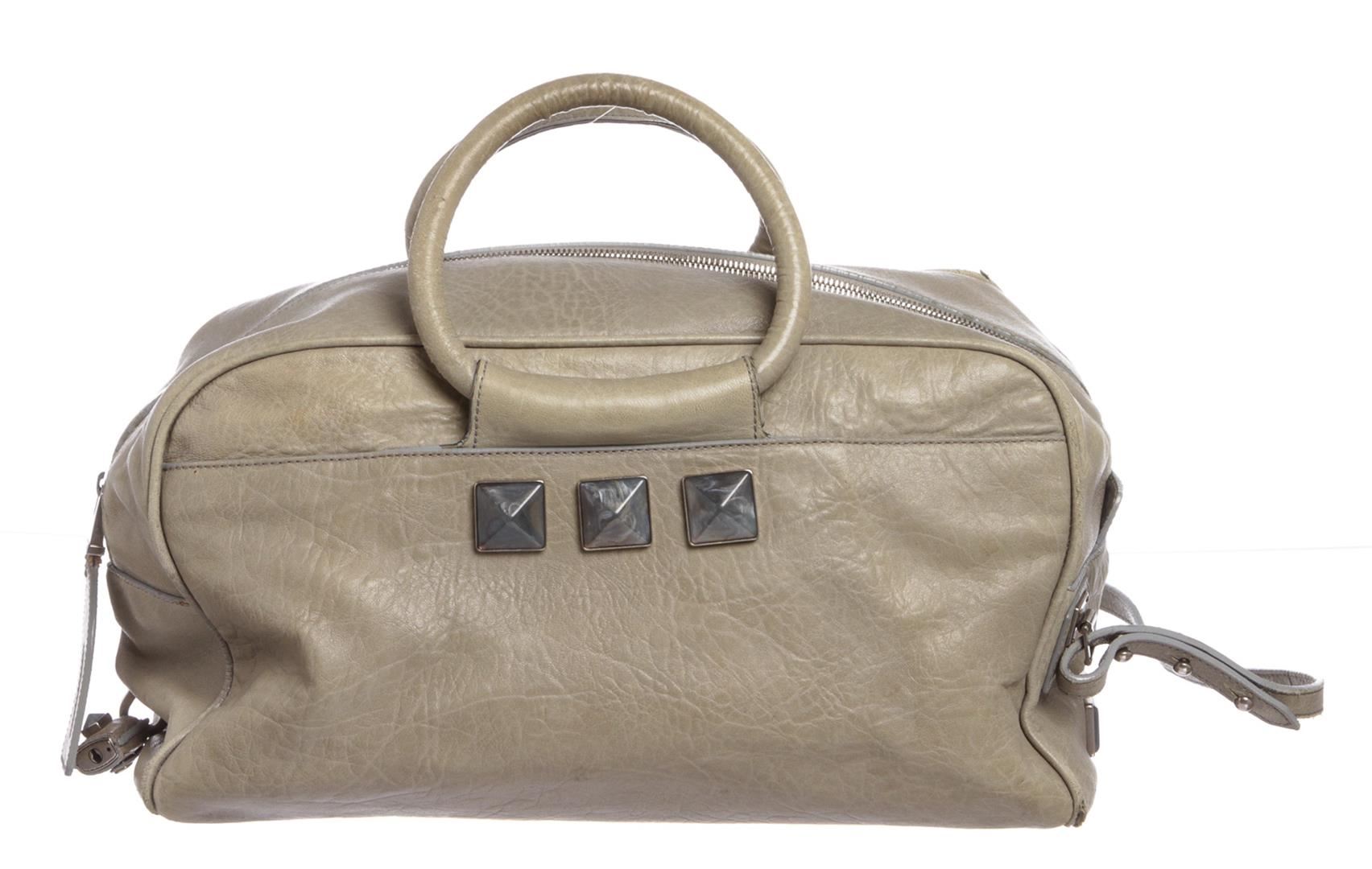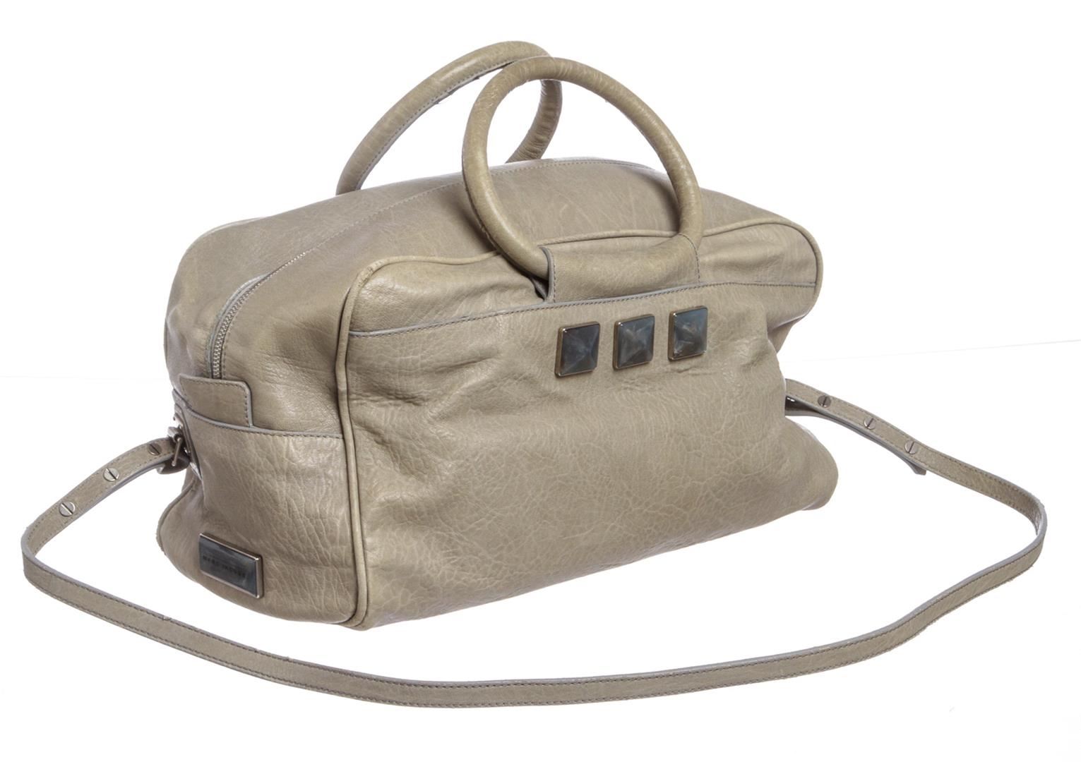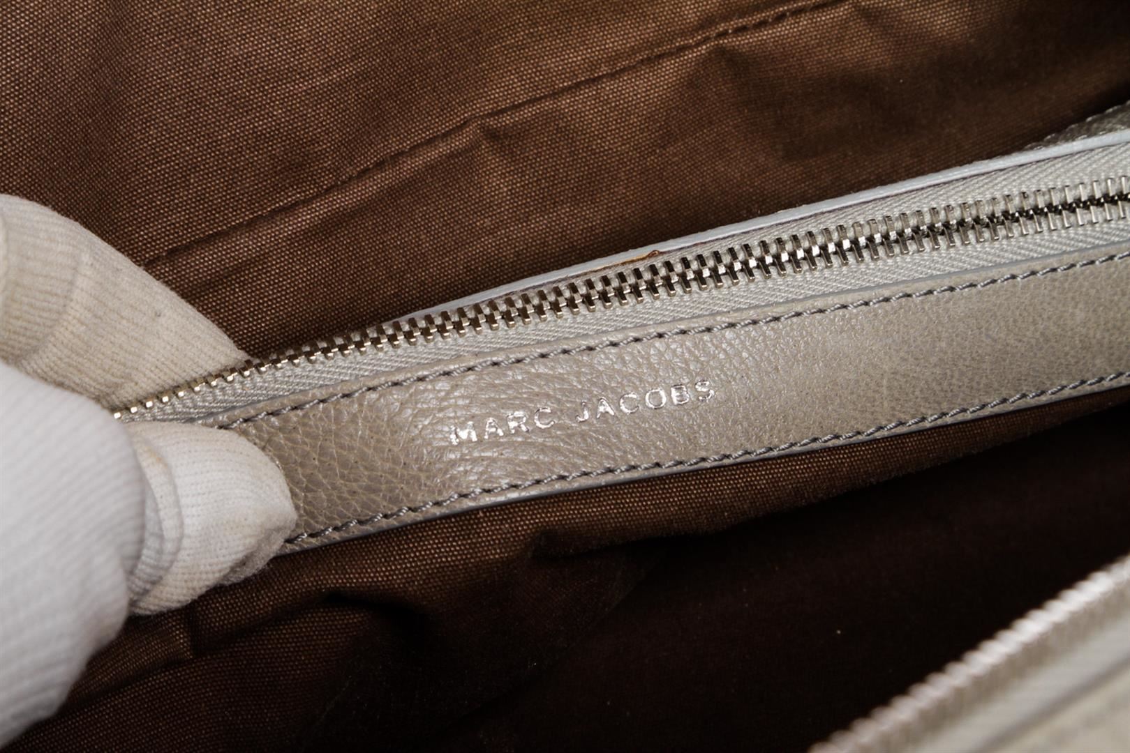 One Marc Jacobs Gray Leather Jeweled Satchel Handbag. Gray leather, silver tone hardware, dual rolled handles, detachable shoulder strap and zip top closure. Interior is brown fabric lined with one side zipper pocket.