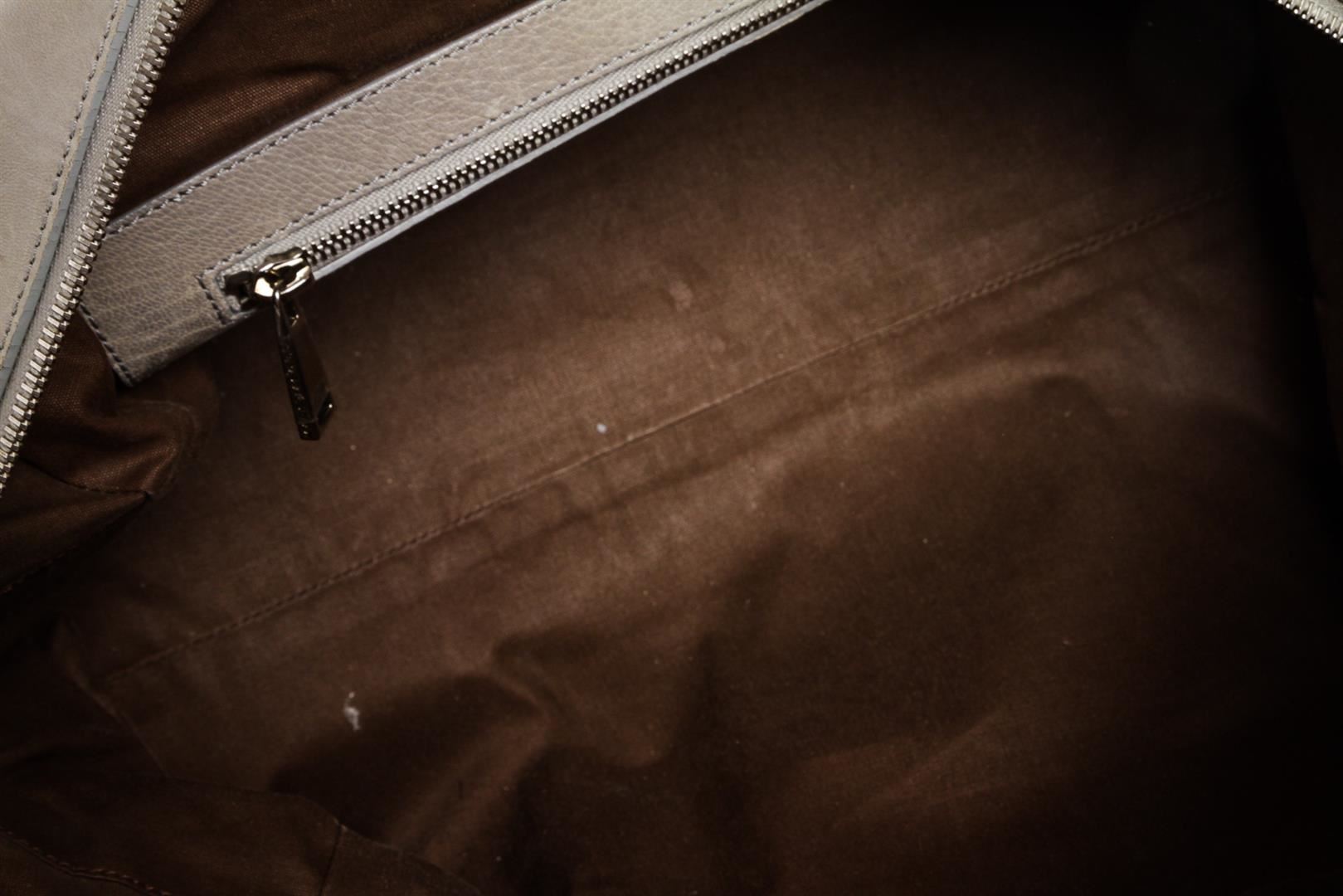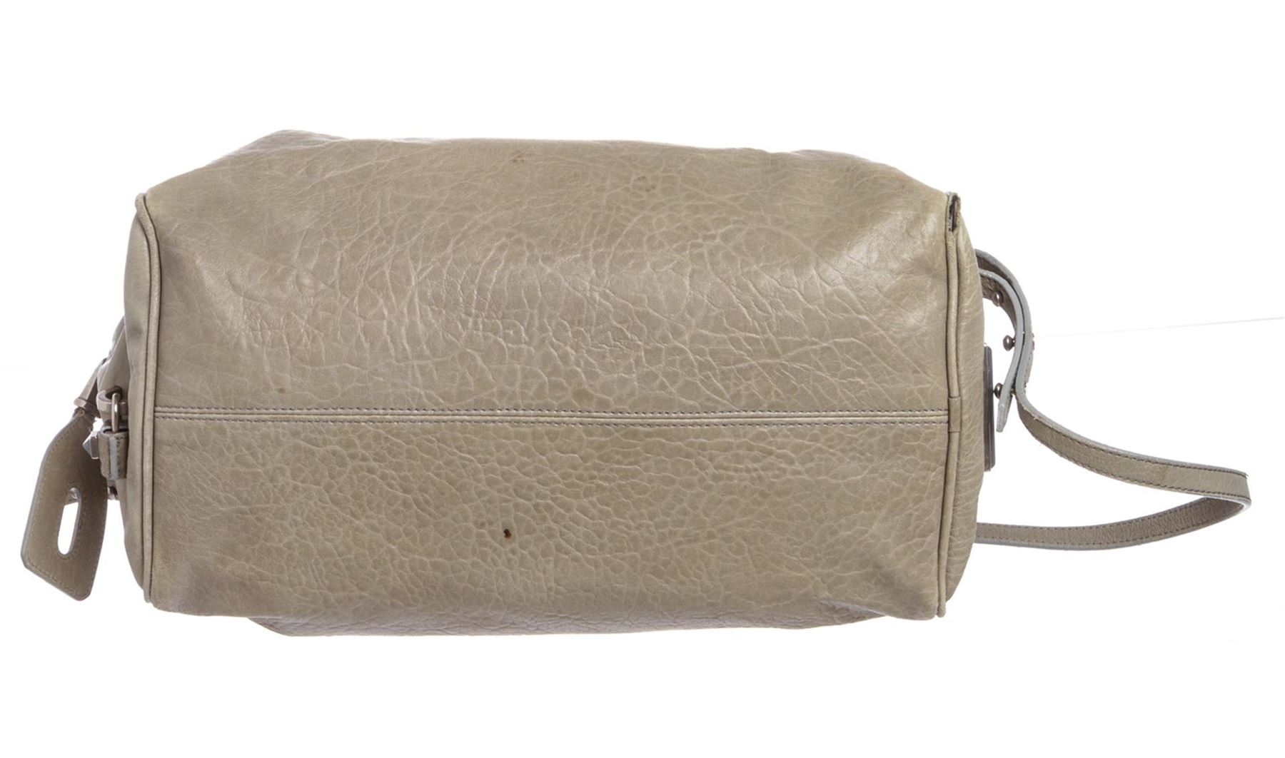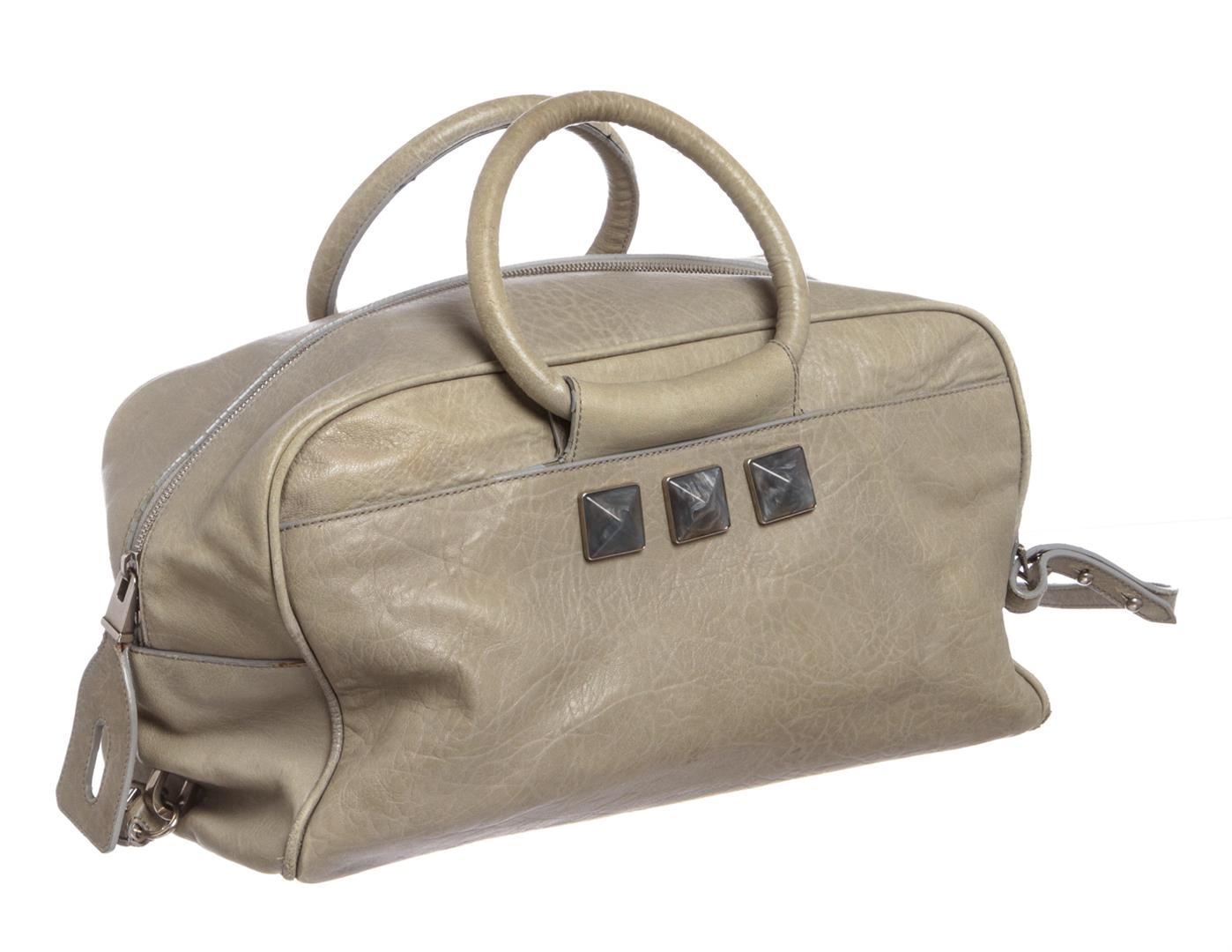 One Marc Jacobs Gray Leather Jeweled Satchel Handbag. Gray leather, silver tone hardware, dual rolled handles, detachable shoulder strap and zip top closure. Interior is brown fabric lined with one side zipper pocket.