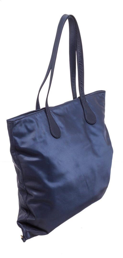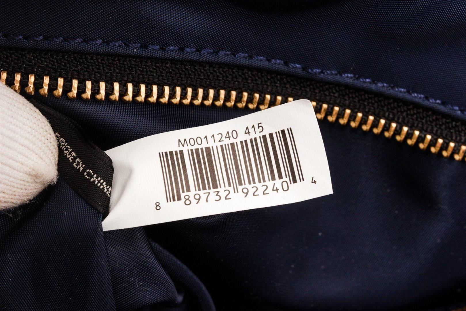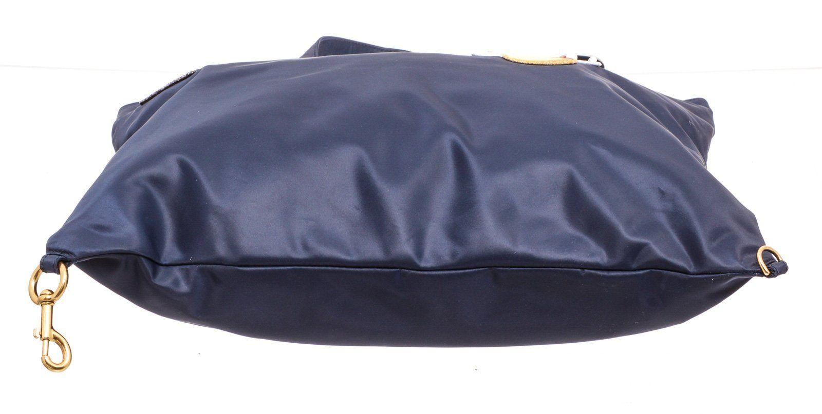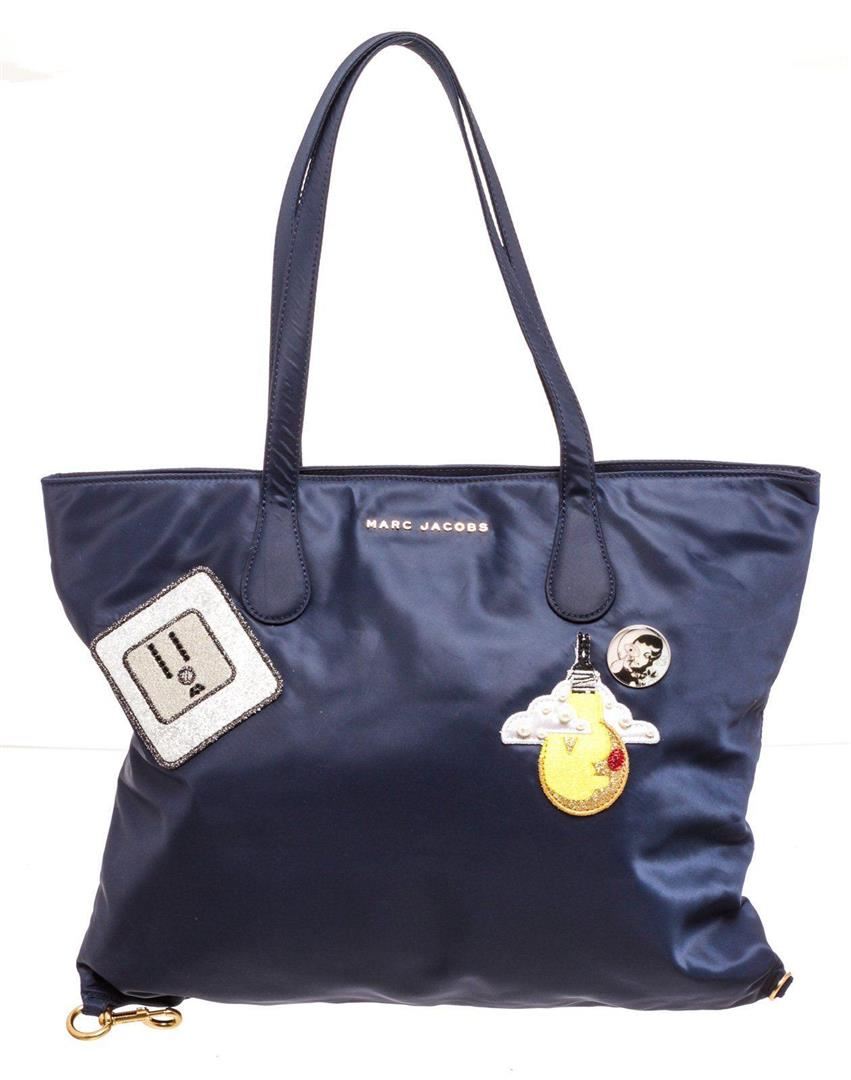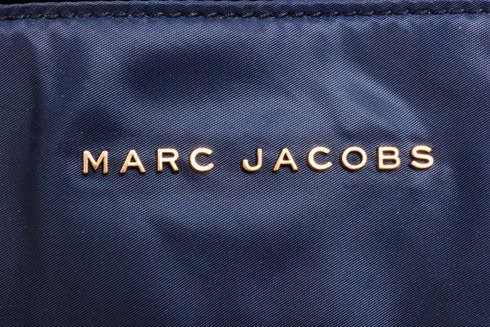Marc Jacobs navy nylon Wingman Shopper tote, dual flat top handles, logo placard and patch designs at front, push keychain lock at bottom to make bag compact, navy nylon interior lining, three interior pockets; one with zip closure, and overall zip closure at top. Measurements: Length: 17.8 in / 45 cm Width: 0.2 in / 1 cm 15.5 in / 39 cm Condition: Pre-Owned Good overall, please see photographs for detail.