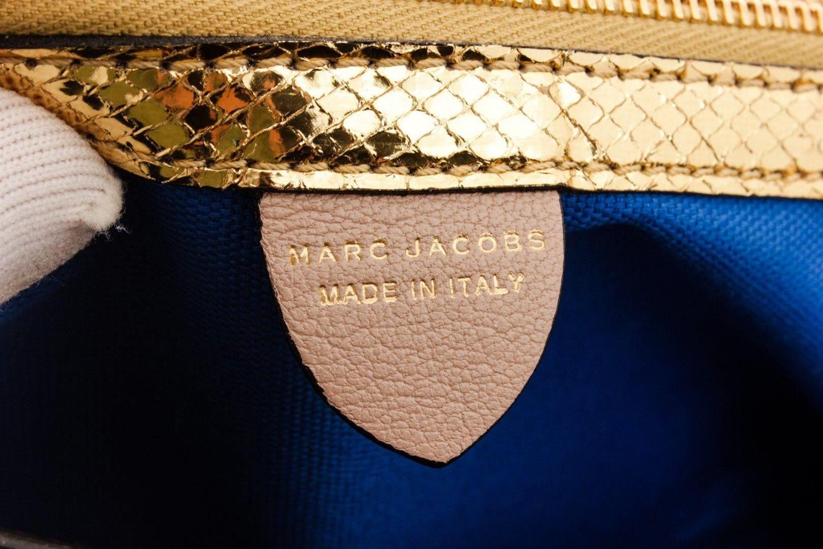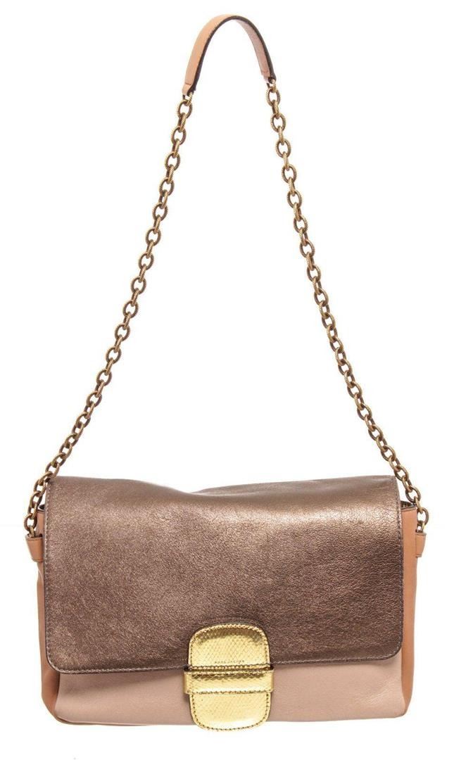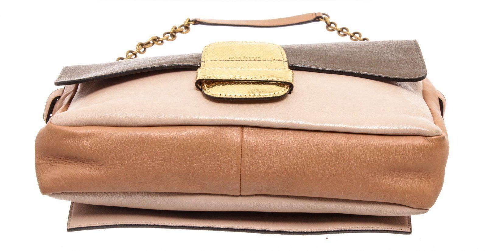 Crafted out of taupe, pink, and bronze leather, single flap closure at front, and chain-link strap with leather. Inner one slip pocket and blue fabric lining. Measurements: Length: 11 in / 28 cm Width: 2 in / 5 cm 9.5 in / 24 cm Condition: Pre-Owned Good overall, please see photographs for detail.
