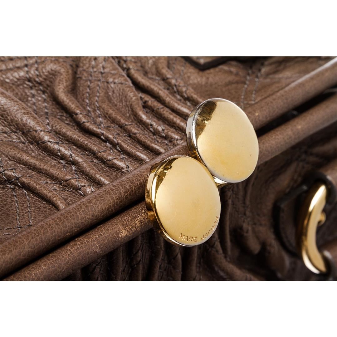 Quilted leather, gold tone hardware, dual rolled handles, detachable chain link shoulder strap and metal twist closure. Interior is beige fabric lined with one side zipper pocket.