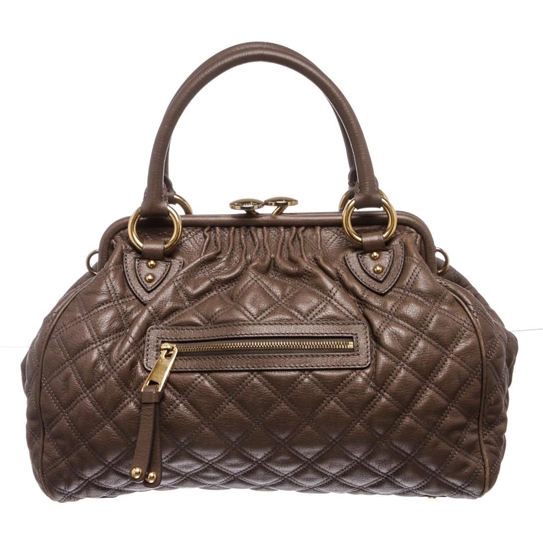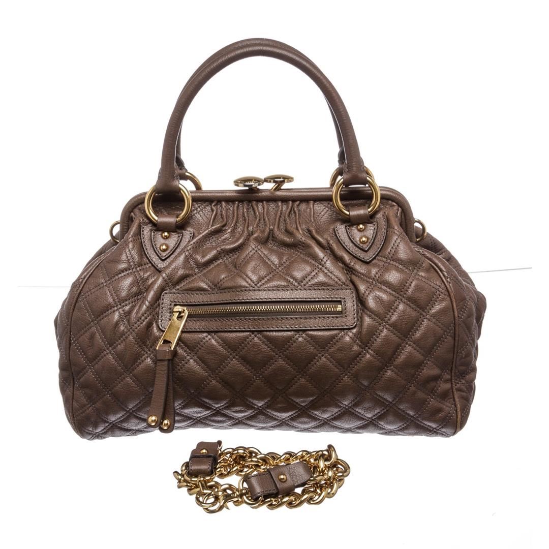 Quilted leather, gold tone hardware, dual rolled handles, detachable chain link shoulder strap and metal twist closure. Interior is beige fabric lined with one side zipper pocket.