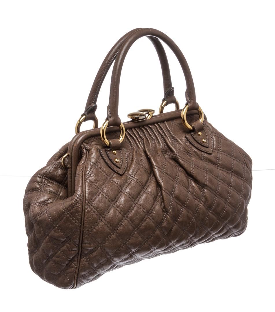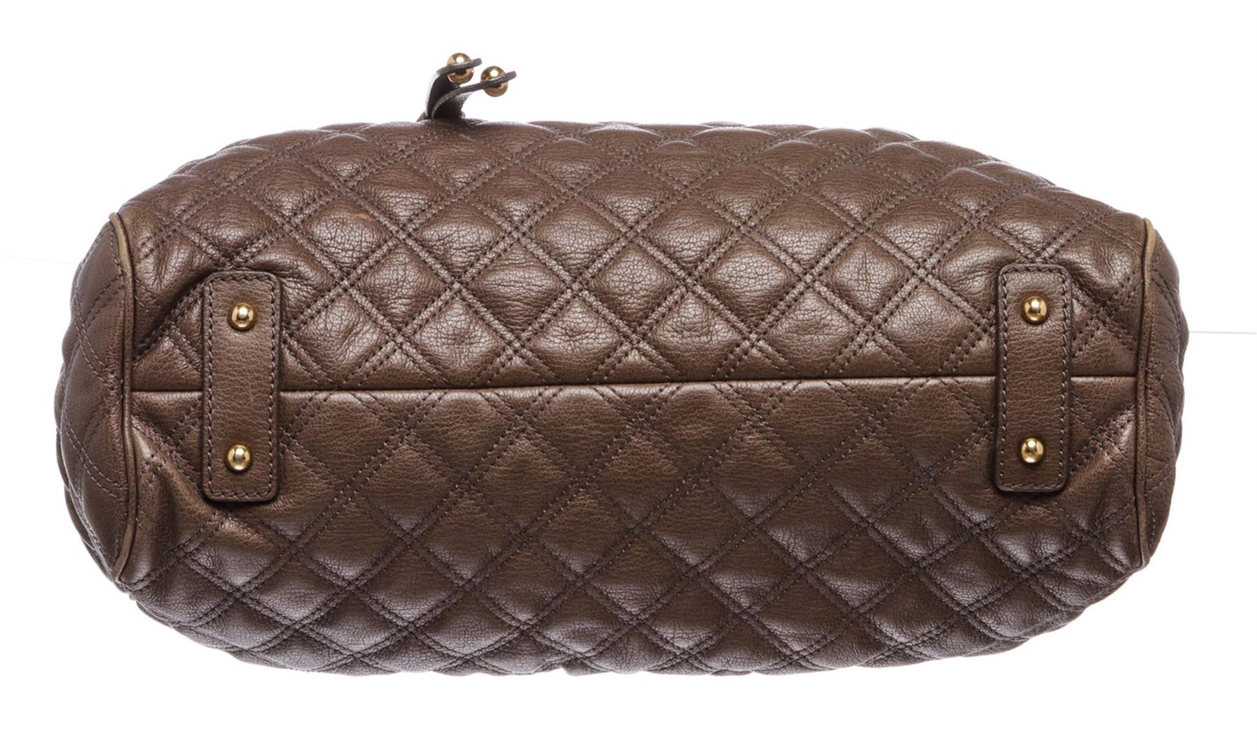 Quilted leather, gold tone hardware, dual rolled handles, detachable chain link shoulder strap and metal twist closure. Interior is beige fabric lined with one side zipper pocket.