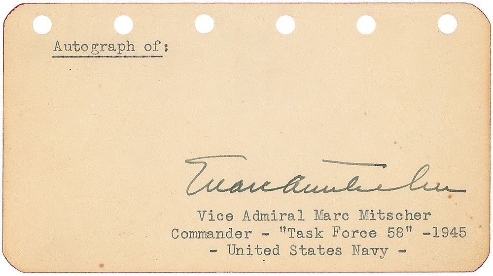 US Navy admiral (1887–1947) who commanded the Fast Carrier Task Force in the Pacific during the latter part of World War II. Vintage fountain pen signature, “Marc Mitscher,” on an off-white 4.5 x 2.5 page. In fine condition, with light edge toning.