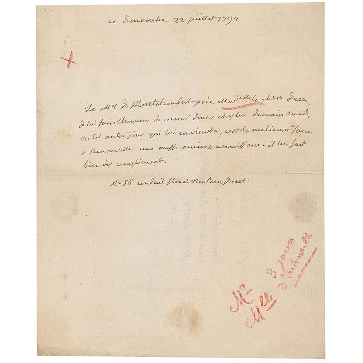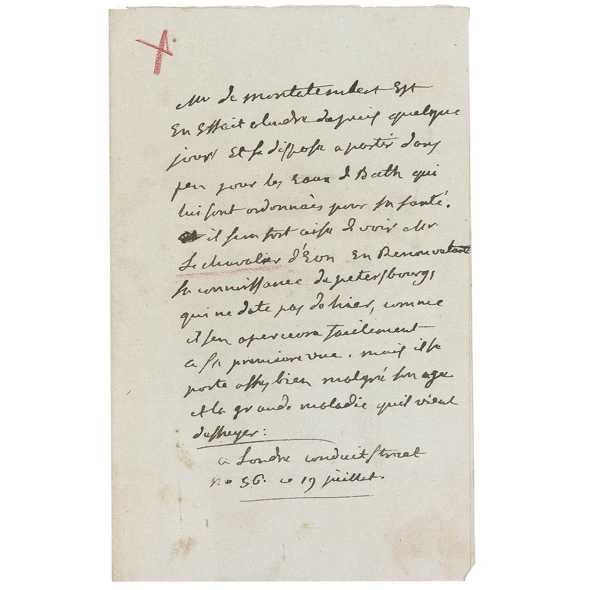 French military engineer and writer (1714–1800) known for his work on fortifications. Two third-person ALSs, to the Chevalier d’Eon, spy for Louis XV. As the “Chevalière d’Eon” he dressed as a woman. During Eon’s secret mission to Russia he is said to have disguised himself as a Lady-in-Waiting to the Empress Elizabeth. Both one page, both from July 1792. The first, July 19 [1792], is addressed to Monsieur le Chev. D’Eon and reads in part: “M. de Montalembert has been in London for a few days and is preparing to take the waters in Bath that have been prescribed for his health. He would be very pleased to see Mr. le Chevalier d’Eon and renew their acquaintanceship from St. Petersburg, which dates from many years past, as he will see at first sight. But he is sufficiently well despite his age and the great illness which he has just contracted…” The second letter, July 22 1792, is addressed to Mademoiselle la Chevaliere D’Eon and reads, in part: “The Marquis de Montalembert prays Mademoiselle la Chev. D’Eon to do him the honor of coming to dine with him tomorrow, Monday, or any other day that will suit her; that’s the best way to renew such an old acquaintance. He sends her many compliments…” In very good condition, with intersecting folds, scattered toning and soiling, and pencil notations to both. Interesting to note, given the recipient d’Eon’s history as a spy, that one letter addresses him as a man, and the other as a woman.