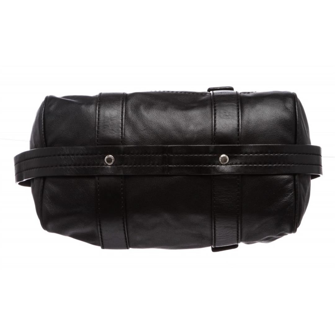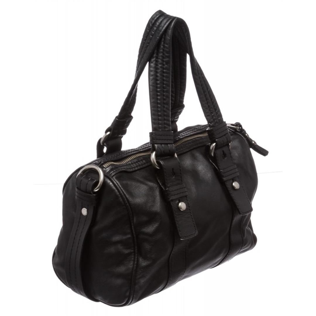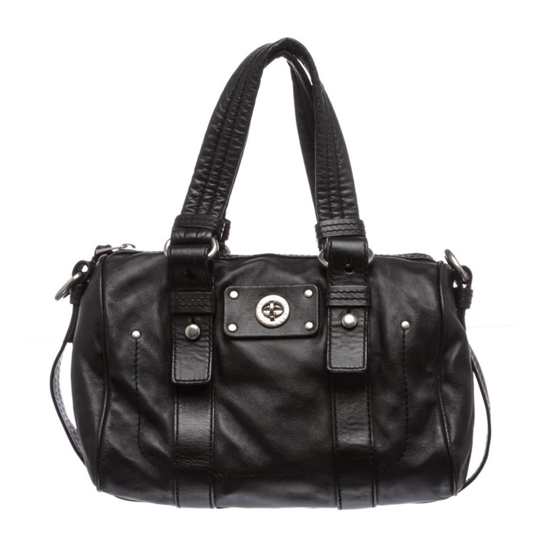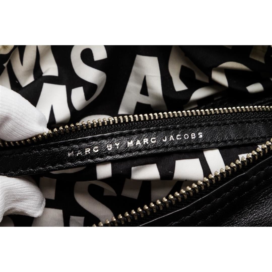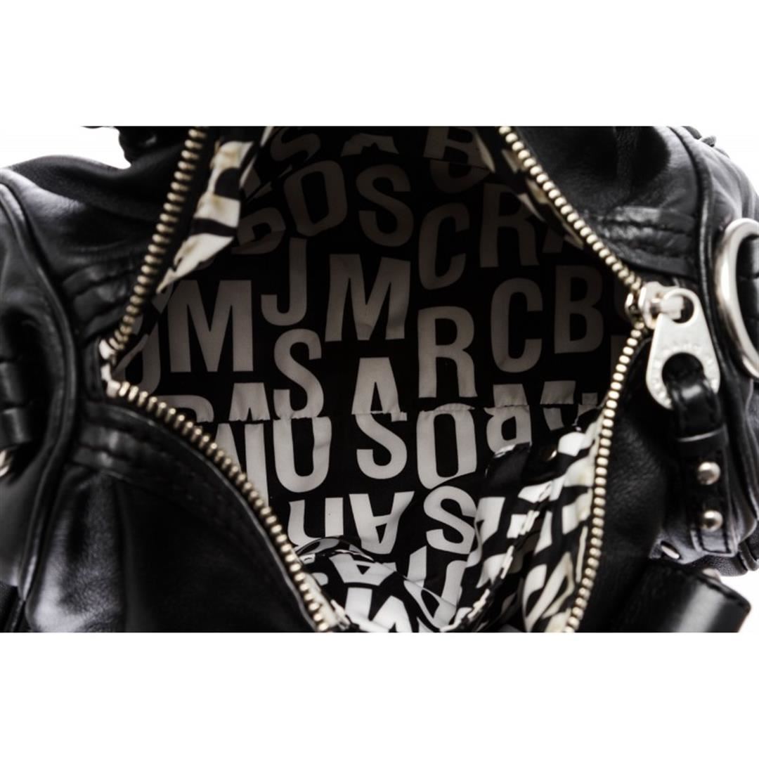 One Marc by Marc Jacobs Black Leather Small Satchel Handbag. Marc by Marc Jacobs black leather small satchel handbag. Silver tone hardware, dual flat handles, zip top closure. Black and white fabric lining, side zip pocket, and sideip pocket.