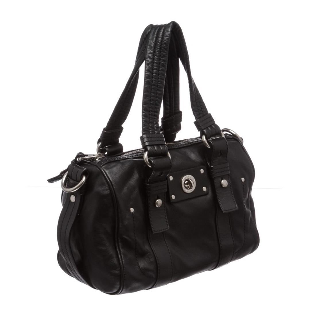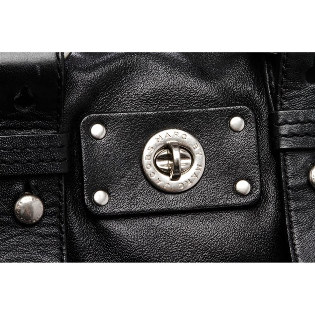 One Marc by Marc Jacobs Black Leather Small Satchel Handbag. Marc by Marc Jacobs black leather small satchel handbag. Silver tone hardware, dual flat handles, zip top closure. Black and white fabric lining, side zip pocket, and sideip pocket. Item is pre-owned.