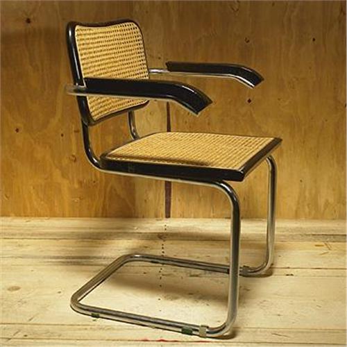 lacquered wood, caning, chrome-plated steel