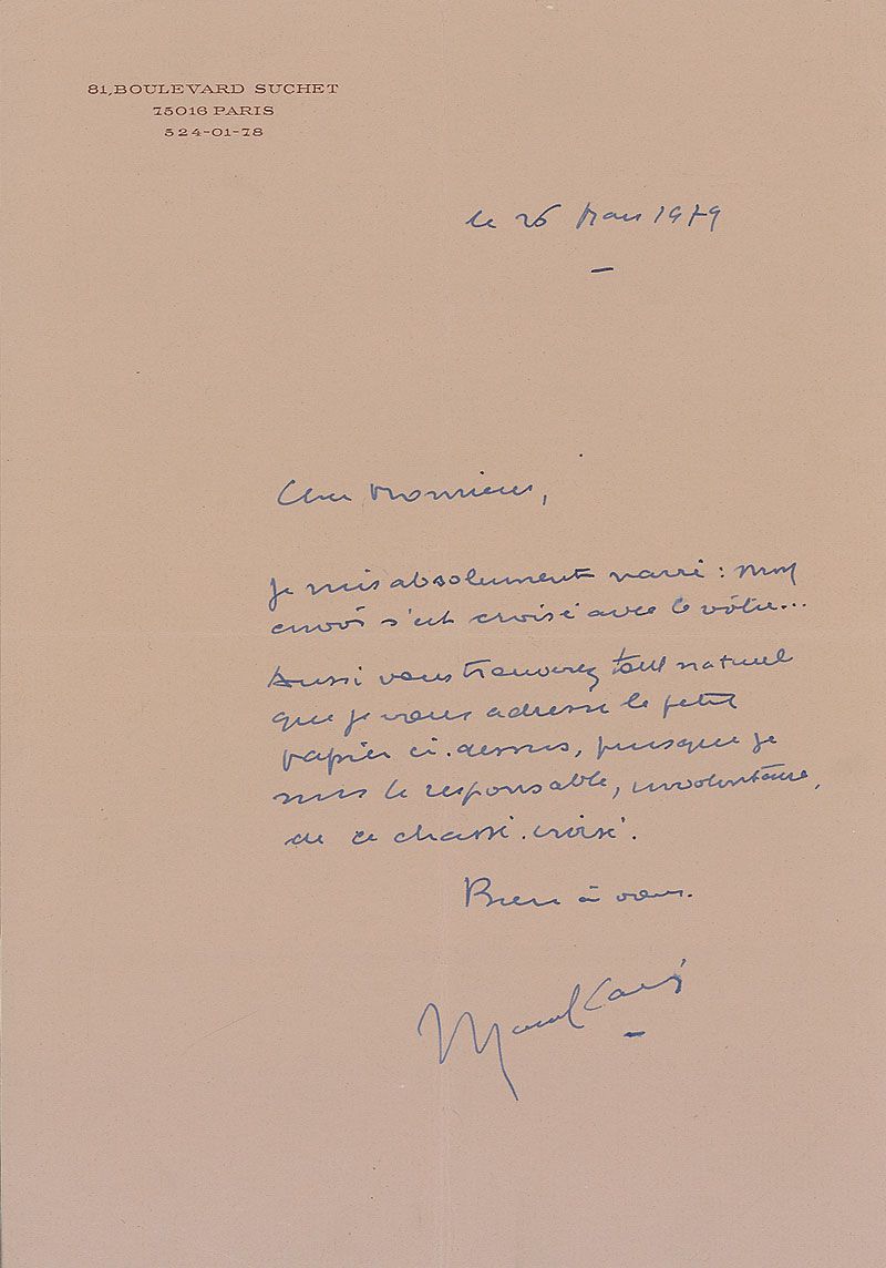 French film director (1906–1996) influential in the poetic realism movement. His 1945 film Children of Paradise is considered one of the greatest films of all time. ALS in French, one page, 7.25 x 10.25, personal letterhead, March 26, 1979. Letter to a gentleman. In full (translated): “I am absolutely broken hearted. My letter has crossed yours…you will find this quite ordinary, since I am responsible for this involuntary cross-chase.” In fine condition, with unobtrusive central vertical and horizontal folds.