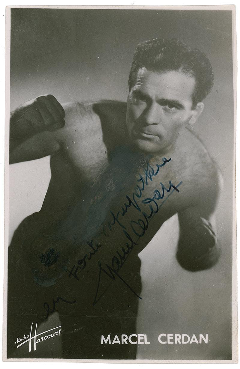 Welterweight and middleweight champion of the world with a record of 104 and 4, he died in a plane crash en route to America for a rematch with then-champion Jake LaMotta. Vintage glossy 4 x 5.75 photo of Cerdan throwing a jab, signed in fountain pen. In very good condition, with surface rubbing from a removed inscription above sentiment, and scattered surface impressions and spotting to finish.