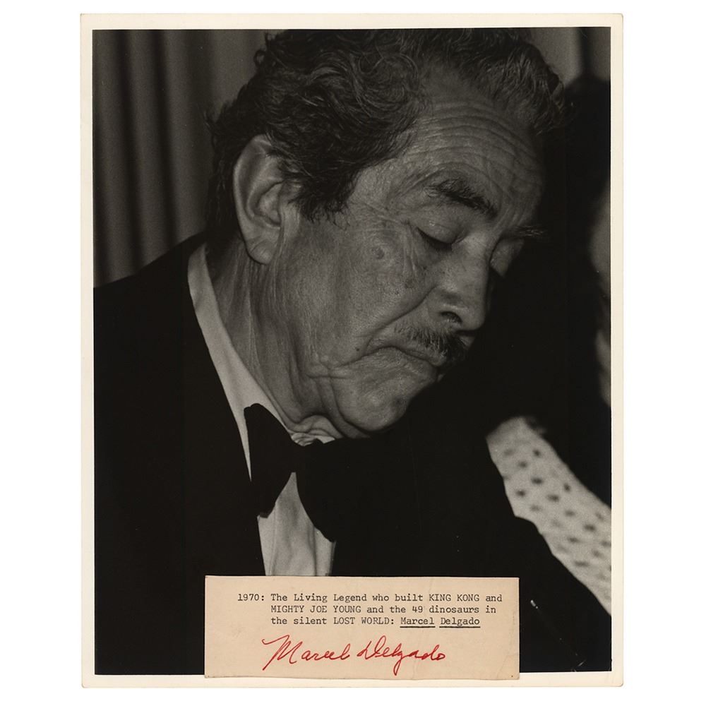 Sculptor and model-maker (1901-1976) whose techniques revolutionized the stop motion film industry. He is best known for his work on the classic 1933 film King Kong. Rare red ink signature, "Marcel Delgado,” on an off-white 4.5 x 1.5 sheet with a typed caption, which is affixed to the bottom of a matte-finish 8 x 10 photo of the special effects pioneer. In fine condition, with light vertical creases.
