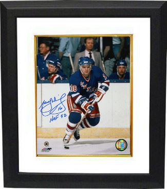 Marcel Dionne is a retired Canadian professional ice hockey centre who played 18 seasons in the National Hockey League for the Detroit Red Wings, Los Angeles Kings and New York Rangers. Marcel Dionne was inducted into the Hockey Hall of Fame in 1992. Marcel Dionne has hand signed this New York Rangers 8x10 Photo with HOF 92 inscription. MAB Hologram and Certificate of Authenticity from Athlon Sports. Custom White Mat and Premium Black Color Framed as shown.
