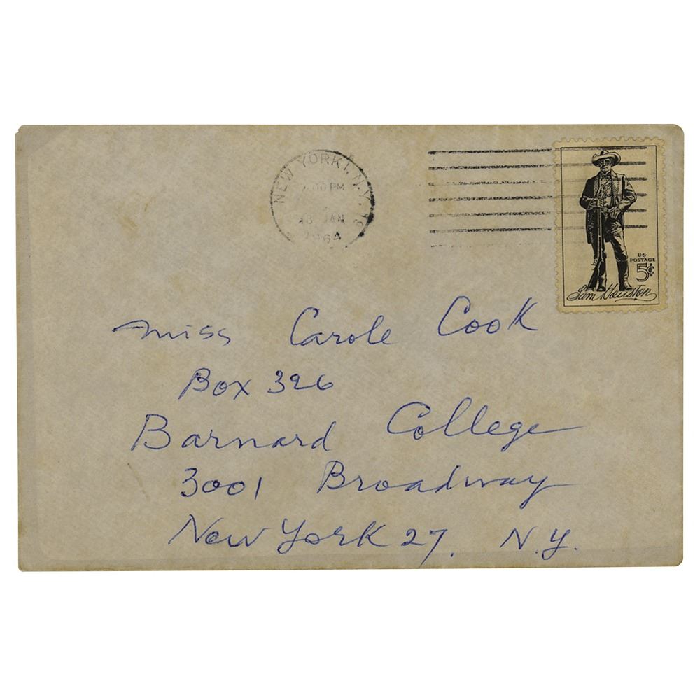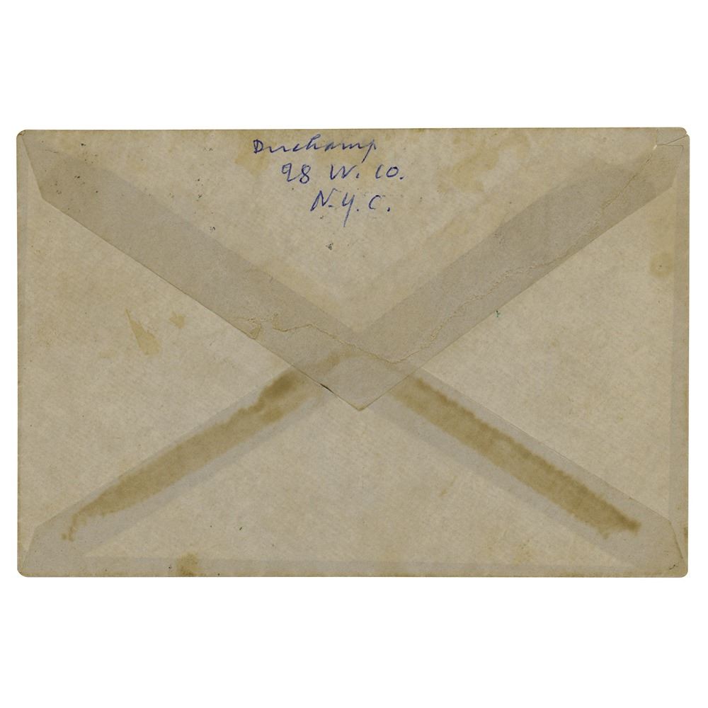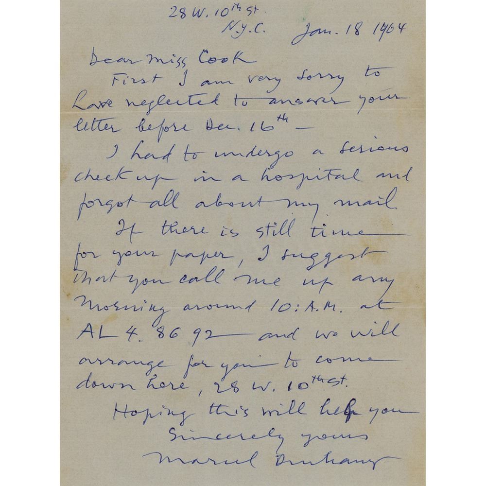 Extremely influential French artist (1887-1968) associated with Dadaism and conceptual art, best remembered for his controversial 'Nude Descending a Staircase, No. 2' painting and his 'Readymade' recontextualized found objects. ALS, one page, 5.75 x 7.75, January 18, 1964. Handwritten letter to Carole Cook at Barnard College, in part: "First I am very sorry to have neglected to answer your letter…I had to undergo a serious check up in a hospital and forgot all about my mail. If there is still for your paper, I suggest that you call me up any morning around 10 A.M. at AL 48692 and we will arrange for you to come down here, 28 W. 10th St. Hoping this will help you." In fine condition. Accompanied by the original mailing envelope addressed in Duchamp's hand, incorporating his surname as part of the return address on the flap.