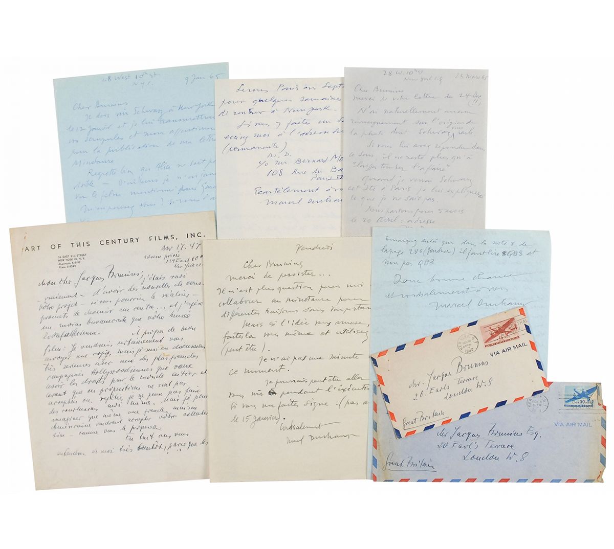 French painter (1887-1968) known for ‘Nude Descending a Staircase, No. 2.’ When this painting was exhibited at the Armory Show in New York City in 1913, it created an uproar and was the focal point for derogatory criticism of the show. Collection of five ALSs in French; all written to Jacques Brunius between 1962-1966 (with two undated); three single-paged, and two one page, both sides. In fine condition, with expected folds, and a small tear to the side of one letter. Accompanied by an additional ALS to Brunius from a gentleman at Art of This Century Films. A selection reads as follows: