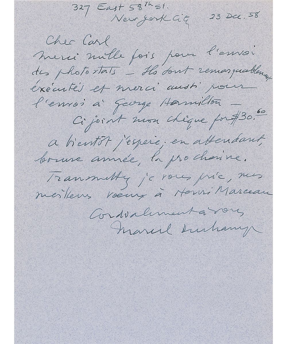 French painter (1887-1968) known for ‘Nude Descending a Staircase, No. 2.’ When this painting was exhibited at the Armory Show in New York City in 1913, it created an uproar and was the focal point for derogatory criticism of the show. ALS in French, one page, 5.75 x 7.75, December 23, 1958. Letter to his photographer, Carl Van Vechten, thanking him for sending some photostats, which he notes are remarkably executed, and thanking him for sending them to George Hamilton. He also forwards a check and asks him to give his best wishes to Henri Marceau. In fine condition.