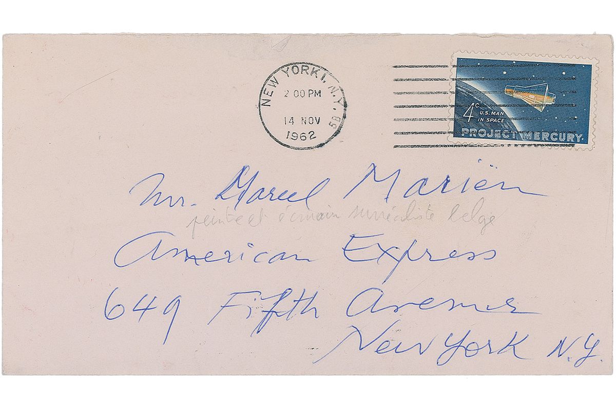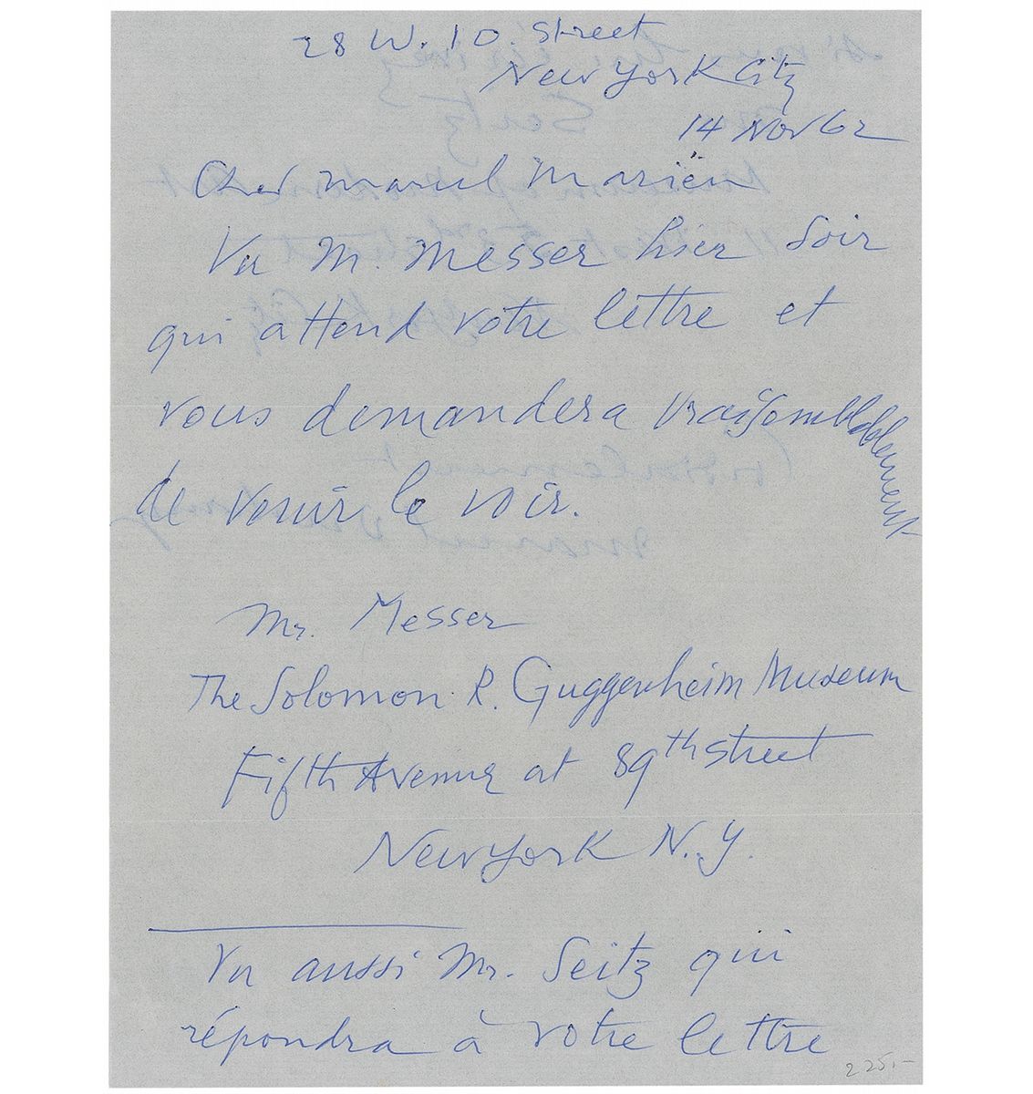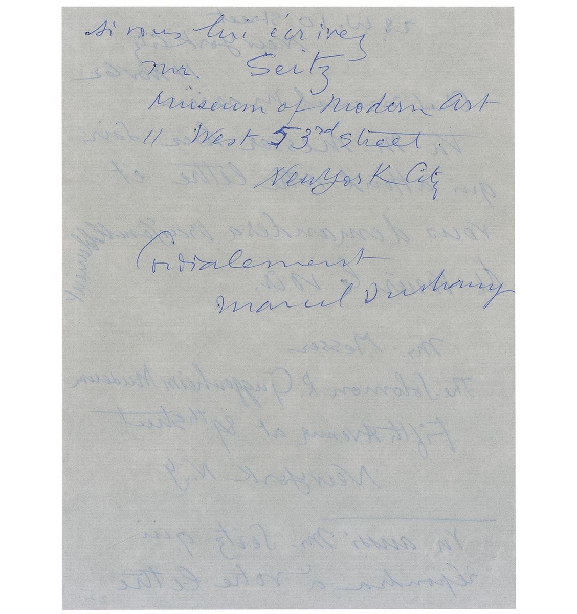 Extremely influential French artist (1887–1968) associated with Dadaism and conceptual art, best remembered for his controversial ‘Nude Descending a Staircase, No. 2’ painting and his ‘Readymade’ recontextualized found objects. ALS in French, one page both sides, 5.75 x 7.75, November 14, 1962. Letter to his friend and fellow artist Marcel Marien, telling him to write to two key figures of the New York museums. In part (translated): “Regarding Mr. Messer he awaits your letter and you will likely be asked to come and see: Mr. Messer, The Solomon R. Guggenheim Museum, Fifth Avenue at 89th Street, New York NY. Regarding Mr. Seitz he will answer your letter if you write it: Mr. Seitz, Museum of Modern Art, 11 West 53rd street, New York City.” In fine condition. Accompanied by the original mailing envelope, addressed in Duchamp’s hand. Marcel Marien (1920–1993) was a Belgian surrealist writer, essayist, poet, editor, but also a photographer, filmmaker, and creator of collages and unusual objects. This letter presents a number of outstanding associations in the modern art scene—Thomas Messer was the longtime director of the Guggenheim Museum, serving for 27 years from 1961 to 1988 (thus far the longest tenure of any director of the city’s major art institutions). Seitz was the curator of the Department of Painting and Sculpture Exhibitions at the Museum of Modern Art from 1960 to 1970; he was both a studio artist and historian, bridging the divide between academic criticism and the practice of studio art. He was largely responsible for raising the study of contemporary art to an academic discipline. Marien only lived in New York for a single year, and in 1963 set out for Communist China to work as a translator on the French edition of the magazine China Under Construction. A truly exquisite and historically intriguing piece connecting the movers-and-shakers of the art world during this period.