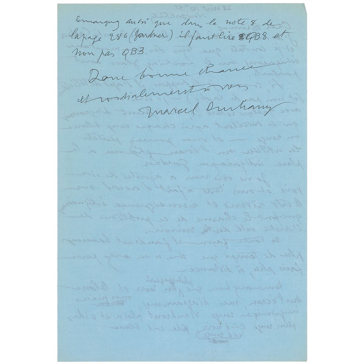 A well-known French actor, director, and writer of his day, Jacques Brunius was deeply involved in the Surrealist movement; as such, he developed a strong working friendship with Duchamp, who had collaborated with the Surrealists from the mid-1930s on, despite his refusal to join the movement himself. While working together on the book In the Margins of French Cinema in 1954, the two found a shared passion for chess, which they later carried into Brunius’s radio show ‘Lewis Carroll: Truancy Master,’ which aired on France Culture radio on Christmas night of 1966 and was centered around a game of chess played “on the other side of the mirror.” Mistaking Brunius’s plan to be for a television show, rather than radio, Duchamp passed along diagrams to be used on screen, taken from a book by Martin Gardner, a popular writer in recreational mathematics and a longtime chess admirer. With interesting commentary on the collaborations of the two men, a mention of Cordier & Ekstrom’s 1965 retrospective of Duchamp’s work, and a refusal to collaborate on “the Minotaur” (most likely the Surrealist journal) due to “several unimportant reasons,” this is an extraordinary collection of letters from Duchamp’s later years, as his life’s work achieved the highest ranks of international celebrity.
