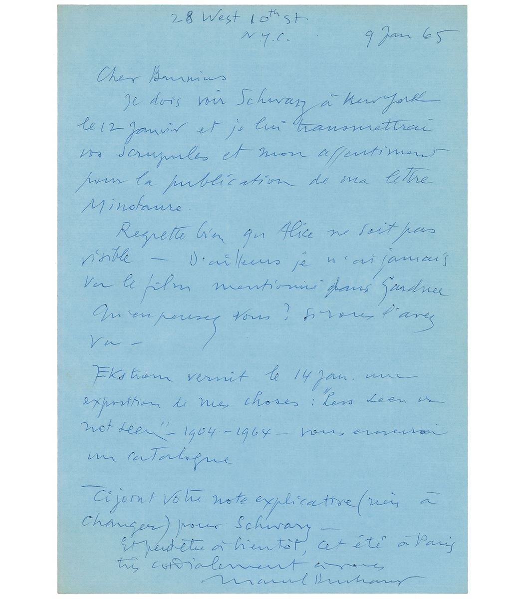 January 9, 1965, New York: “I have to see Schwarz in New York on January 12 and I will pass on your scruples and my approval for publication of my letter in Minotaur. Regret that Alice is not visible—in fact I never saw the movie mentioned in Gardner. What do you think of it? If you have seen it. On Jan 14 Ekstrom has a preview of my things: ‘Less seen or not seen’—1904–1964—will send you a catalog.”