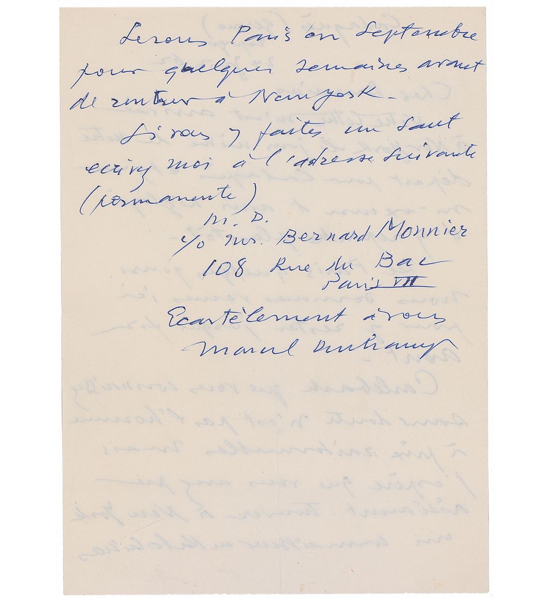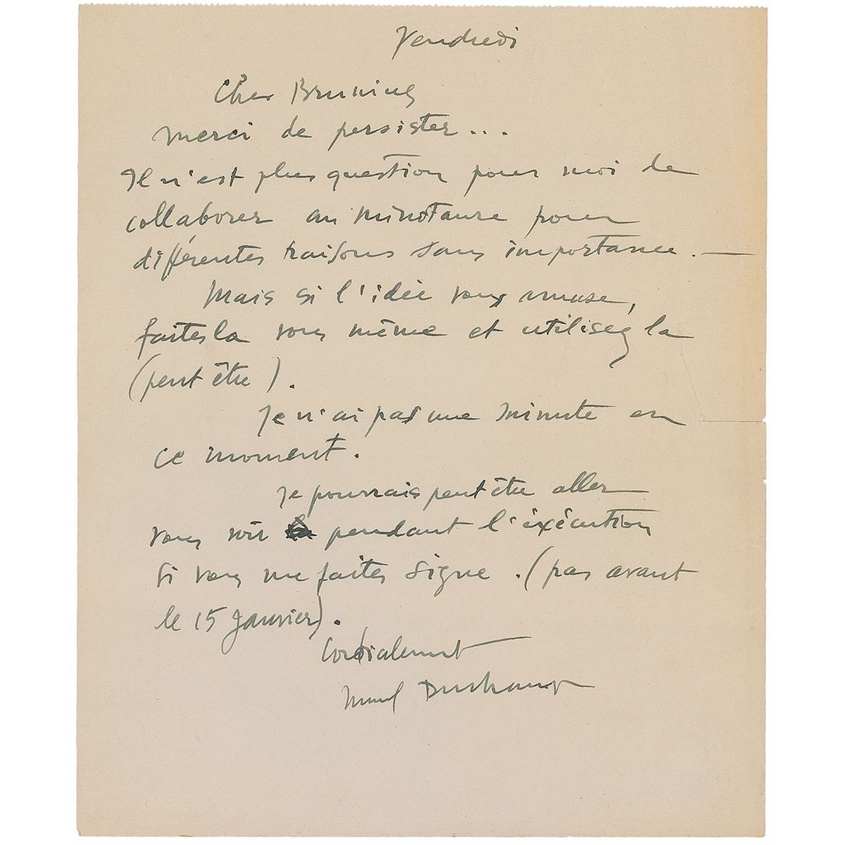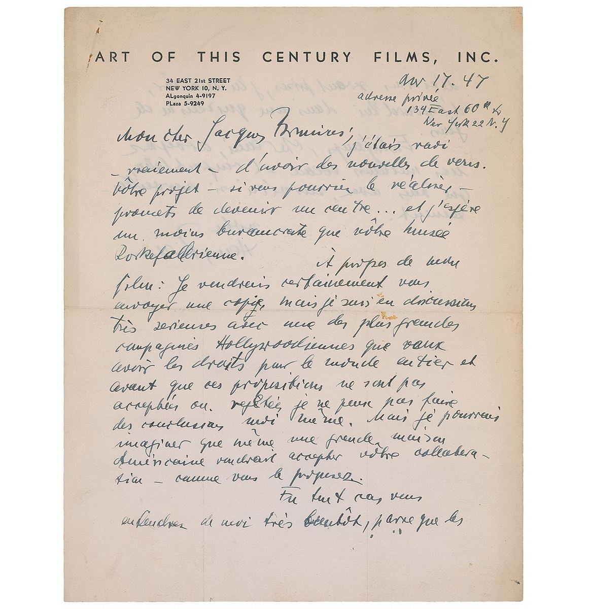 French painter (1887-1968) known for ‘Nude Descending a Staircase, No. 2.’ Collection of five ALSs in French, all written to Jacques Brunius between 1962-1966 (with two undated), three single-paged, and two one page, both sides. In fine condition, with expected folds, and a small tear to the side of one letter. Accompanied by an additional ALS to Brunius from a gentleman at Art of This Century Films. A selection reads as follows: