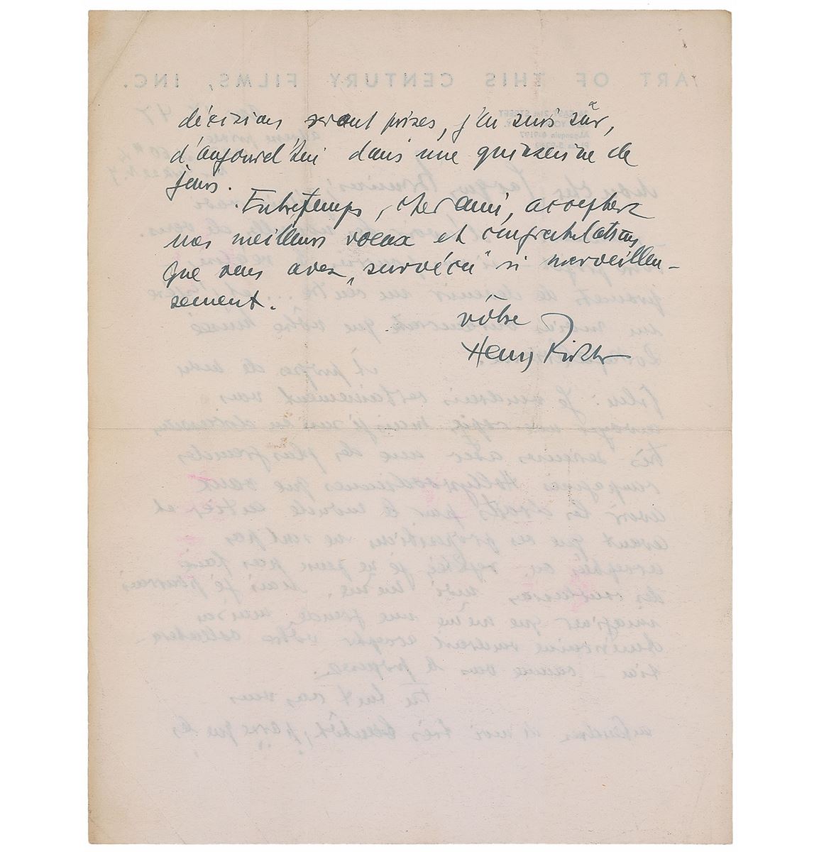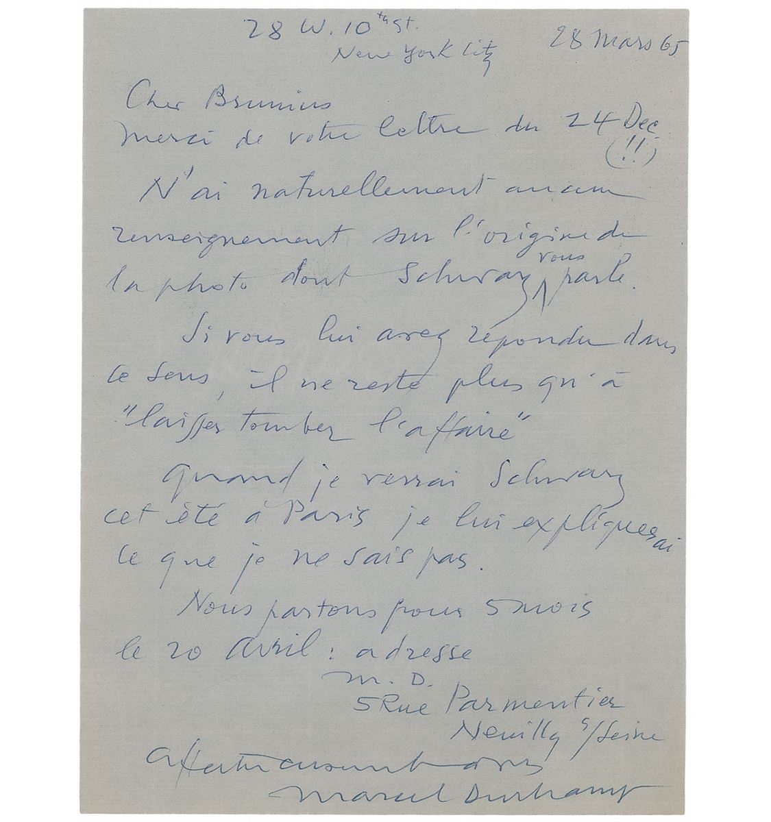 March 28, 1965, New York: “Thank you for your letter…Of course I have no information on the photo’s origin that Schwarz is talking to you about. If you have replied to him in that sense, there is nothing left but ‘to drop the matter.’ When I will see Schwarz this summer in Paris I will explain to him what I do not know. We are leaving for 5 months on April 20.” [to Neuilly s/Seine]