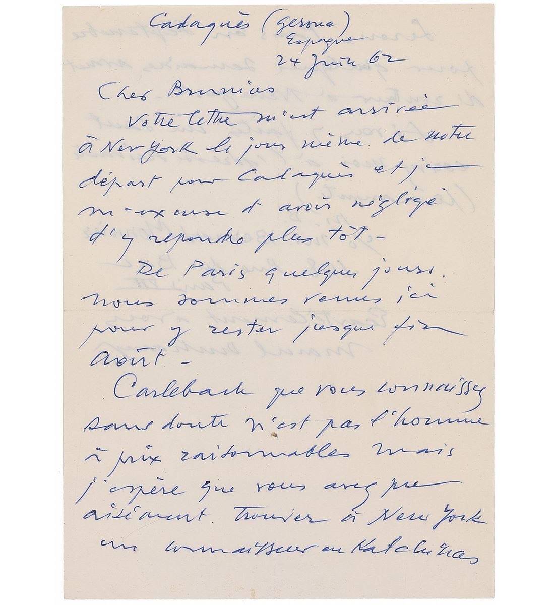 June 24, 1962, Cadaqués (Girona, Spain): “We came here from a few days in Paris to stay until the end of August. Carlebach whom you probably know is not the man with a reasonable price but I hope that you have been able to easily find in New York an expert in Kachinas [dolls]. We will be in Paris in September for a few weeks before returning to New York.”