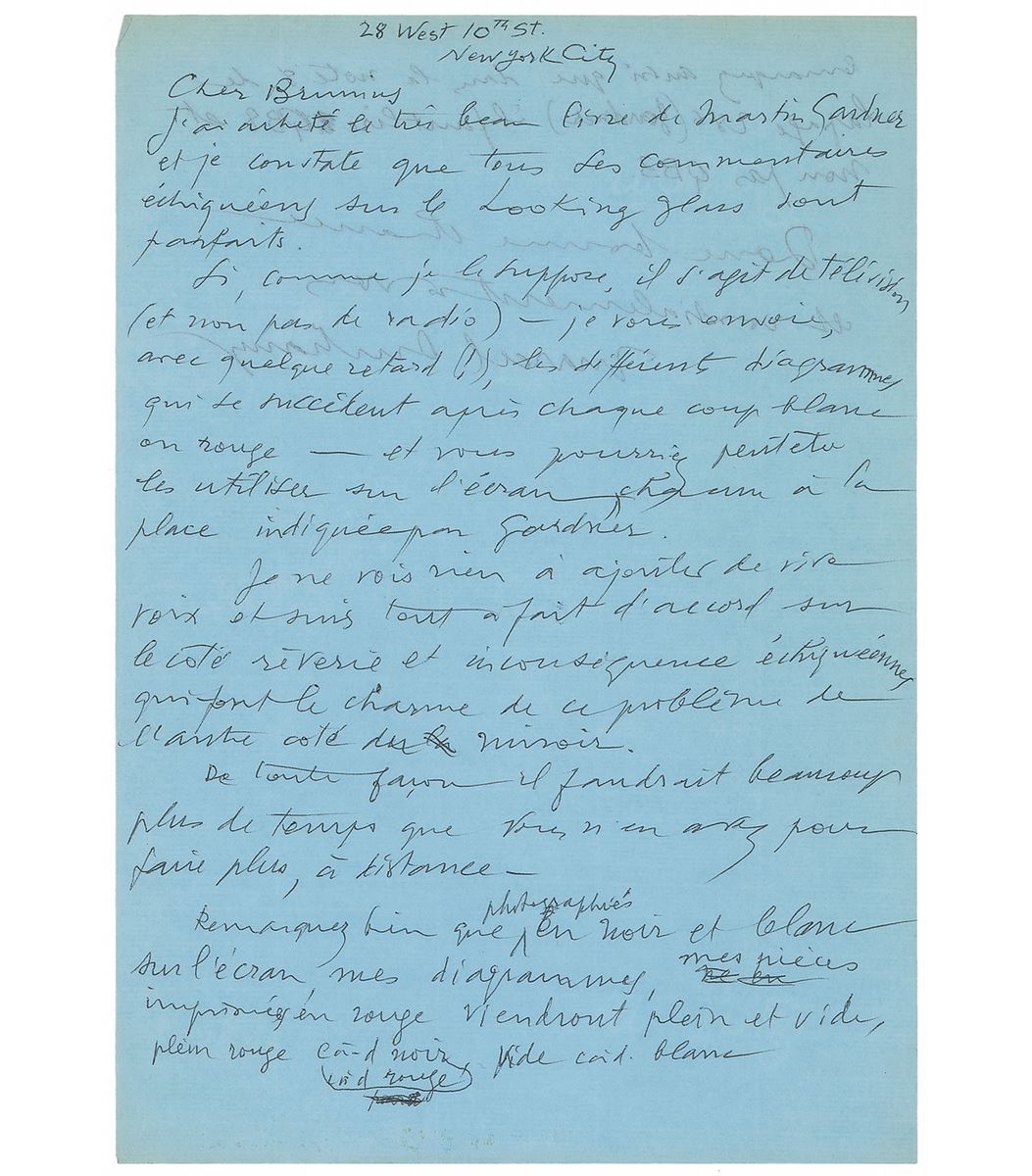 Undated [but 1966], New York: “I bought the very nice book of Martin Gardner and I note that all the commentaries relating to chess on the looking glass are perfect. If it is in fact as I suspect, about television (and not radio)—I am sending you—with some delay (!), different diagrams succeeding one another after each white or red stroke—and maybe you could use them on the screen, each to the spot indicated by Gardner. I see nothing else to add verbally and I agree completely on the dreamy aspect and inconsequent chess games making the charm of this problem on the other side of the mirror. At any rate, it would take a lot more time than you have to do more from a distance—Notice that the black and white photos on the screen, my diagrams, my pieces printed in red will come full and empty, full red which means black, red, empty which means white. Notice also that on note 8 of page 286 (Gardner) one must read QB8 and not QB3.”
