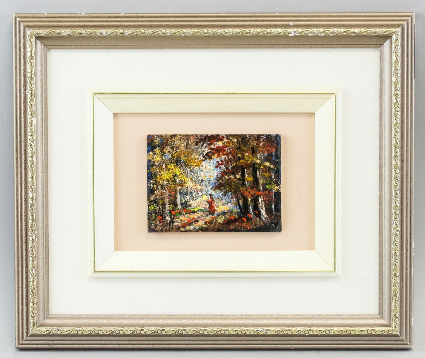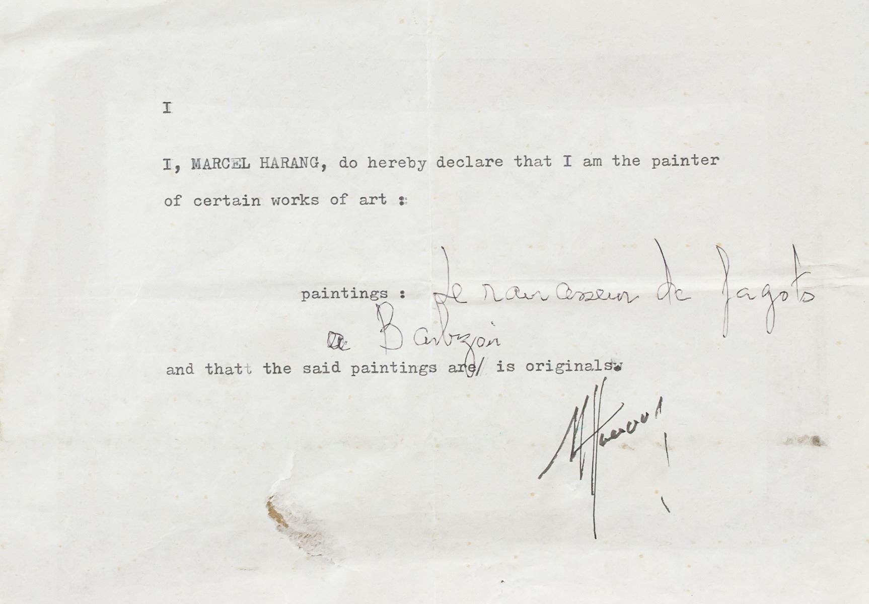 Oil on panel, framed. Featuring bright landscape scene with a figure dressed in red standing in the center. Paper affixed to verso reads "I I, MARCEL HARANG, do hereby declare that I am the painter of certain works of art: paintings: Le Nan [illegible] de fagoto and that the said paintings are/is originals." Signed "Harang" beneath the writing. Attributed to Marcel Harang (1910-?, French). 8 x 11 cm (3.25 x 4.25 in), Frame: 27 x 33 cm (11 x 13 in). PROVENANCE: Toronto estate