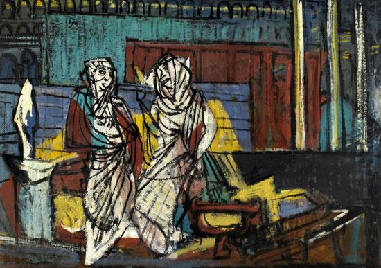 Marcel Janco, Romanian and Israeli painting, 1895 - 1984, Two Oriental Women, 1935-7, Oil on wood, 49x70cm, , , "100 Years to the Birth of Janco", National Museum of painting, Bucarest, Romania., , Has the Atelier Janco label on the reverse. Item from abroad.