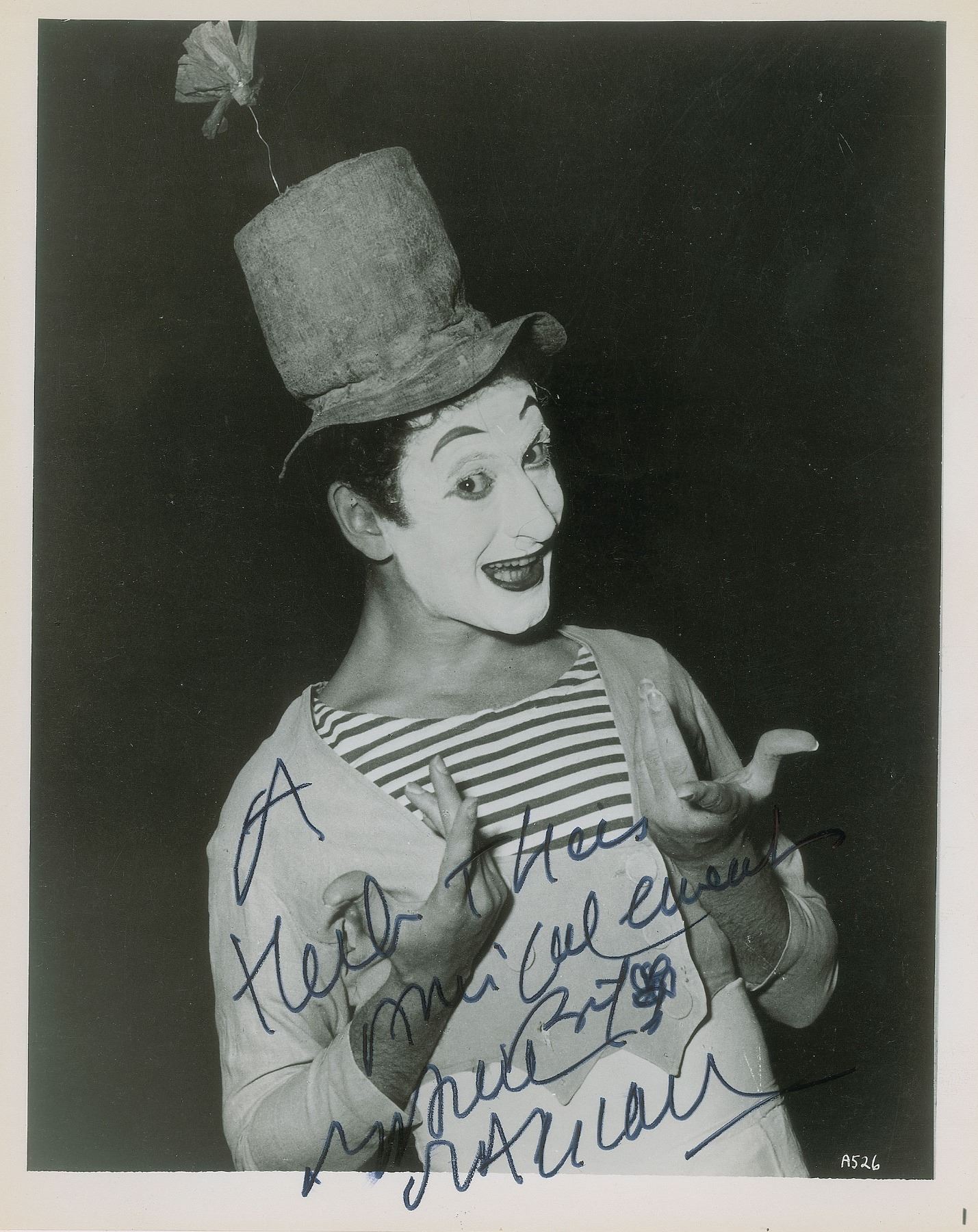 Glossy 8 x 10 half-length photo of the famous French mime, signed and inscribed in black felt tip, "A Herb Theis…Bip, Marcel Marceau," who adds a small flower sketch. In fine condition.