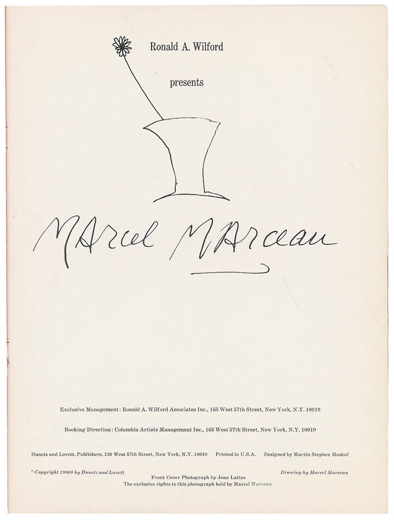 Marcel Marceau program, 9 x 12, signed on the inside of the back cover in black felt tip, “Bip, Marcel Marceau, 1968,” adding a small flower. In fine condition, with light toning and rubbing to the cover.