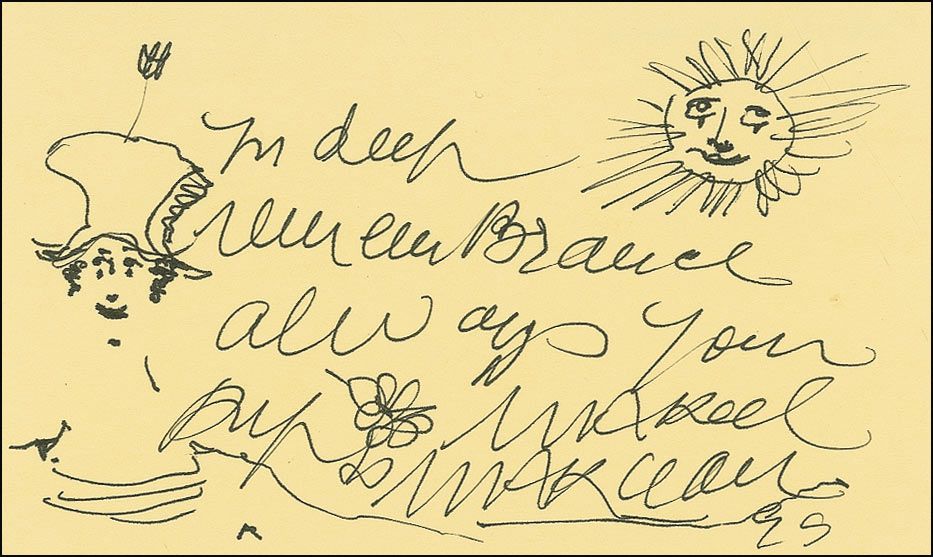 Original ink sketch of a self-portrait and a smiling sun on a yellow 5 x 3 card, with Marceau adding, “In Deep Remembrance, Yours Always, Marcel Mareau, Bip.” In fine condition.