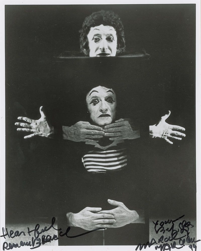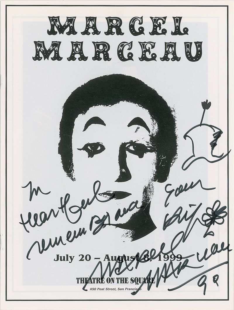 Program from a 1999 performance at the Theatre On the Square in San Francisco, 8 x 10.75, signed on the cover in black felt tip, “M Hear & Feel, remembrance, your, Marcel Marceau 1999, Bip,” adding a sketch of a top hat and flower; and a glossy 8 x 10 photo of Marcel performing, signed in black felt tip, “Hear & Feel, remembrance, Your, Marcel Marceau 1999, Bip,” adding a quick flower sketch. In fine condition.
