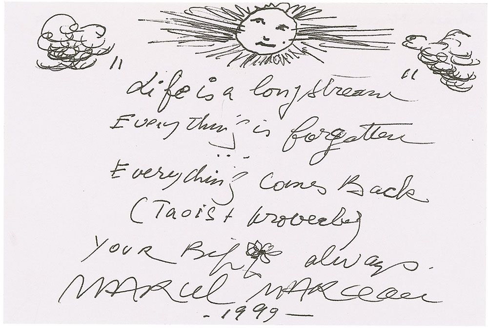 AQS on an off-white 6 x 4 card. Marceau writes “‘Life is a long stream’ Everything is forgotten, Everything comes back.” Signed at the bottom, “Your Bip always, Marcel Marceau 1999,” adding sketches of the sun, two rain clouds and a small flower. In fine condition.