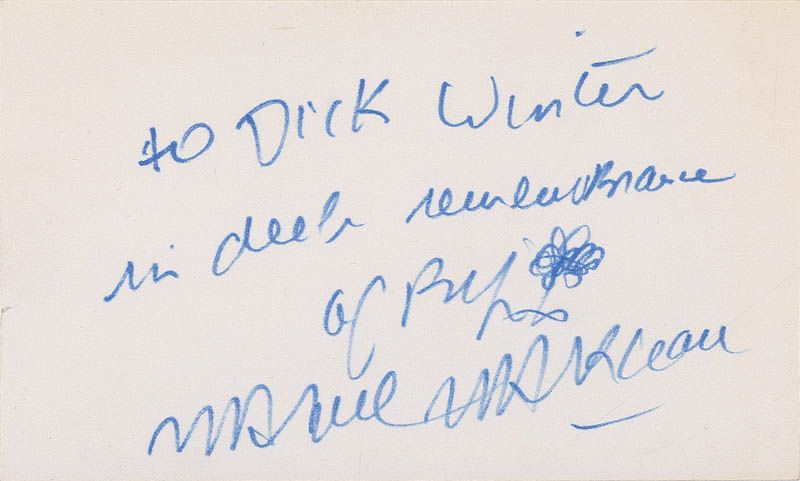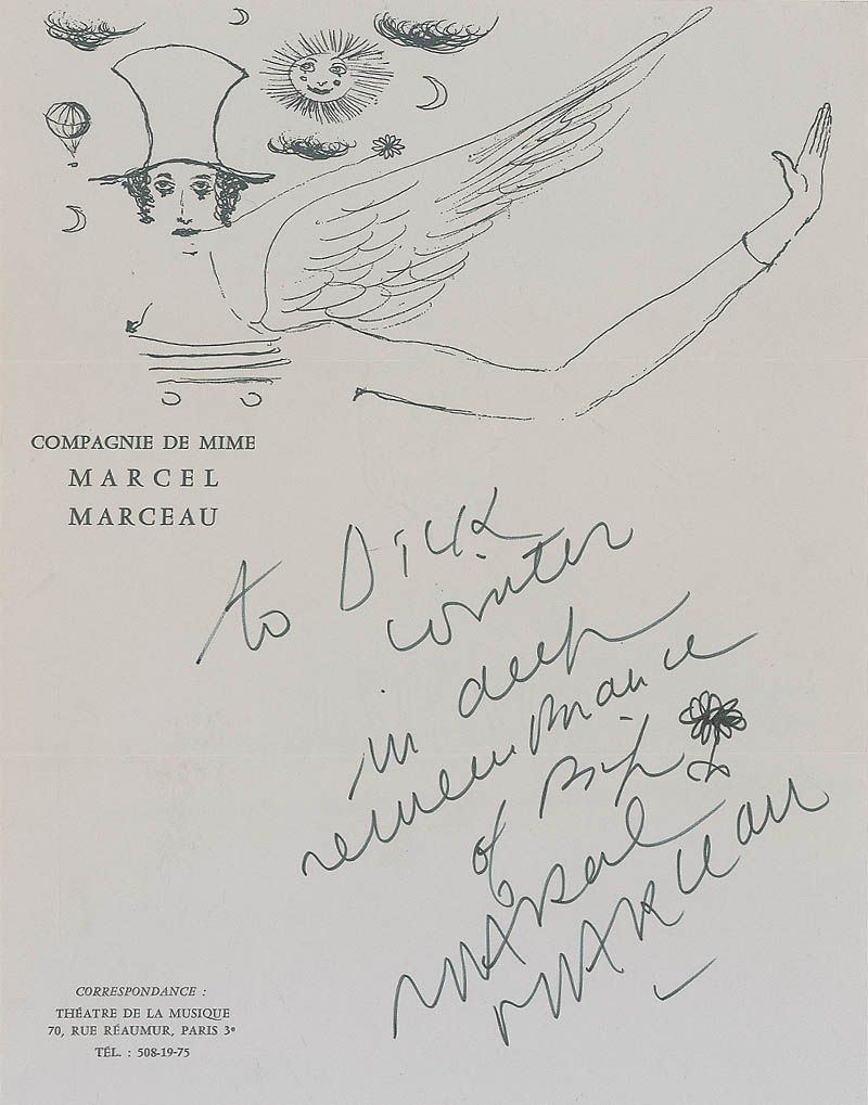 Two items: one ANS with a brief sentiment in French and flower sketch on fantastic personal letterhead, 8.25 x 10.75; and a felt tip signature and inscription in French, signed “Marcel Marceau,” on an off-white 5 x 3 card. In overall fine condition.